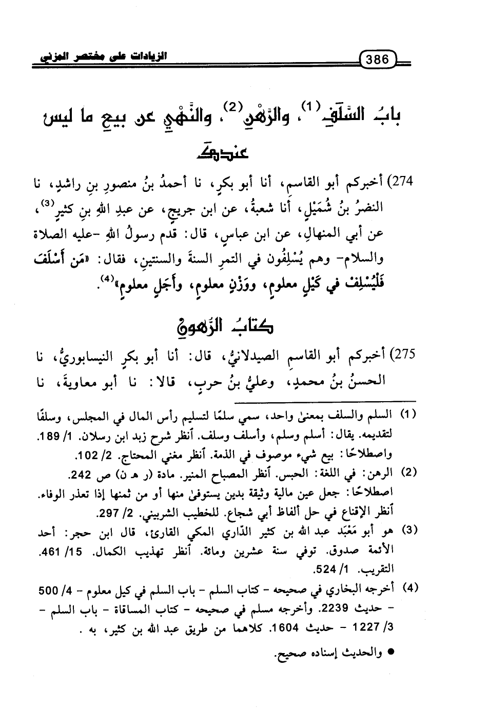 274 - أَخْبَرَكُمْ أَبُو الْقَاسِمِ، أنا أَبُو بَكْرٍ، نا أَحْمَدُ بْنُ مَنْصُورِ بْنِ رَاشِدٍ، نا النَّضْرُ بْنُ شُمَيْلٍ، أنا شُعْبَةُ، عَنِ ابْنِ جُرَيْجٍ، عَنْ عَبْدِ اللَّهِ بْنِ كَثِيرٍ، عَنْ أَبِي الْمِنْهَالِ، عَنِ ابْنِ عَبَّاسٍ، قَالَ: قَدِمَ رَسُولُ اللَّهِ، عَلَيْهِ الصَّلاةُ وَالسَّلامُ، وَهُمْ يُسْلِفُونَ فِي التَّمْرِ السَّنَةَ وَالسَّنَتَيْنِ، فَقَالَ: «مَنْ أَسْلَفَ فَلْيُسْلِفْ فِي كَيْلٍ مَعْلُومٍ، وَوَزْنٍ مَعْلُومٍ، وَأَجَلٍ مَعْلُومٍ»