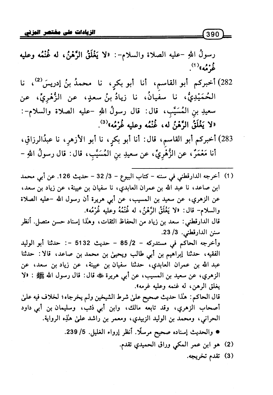 282 - أَخْبَرَكُمْ أَبُو الْقَاسِمِ، أنا أَبُو بَكْرٍ، نا مُحَمَّدُ بْنُ إِدْرِيسَ، نا الْحُمَيْدِيُّ، نا سُفْيَانُ، نا زِيَادُ بْنُ سَعْدٍ، عَنِ الزُّهْرِيِّ، عَنْ سَعِيدِ بْنِ الْمُسَيِّبِ، قَالَ: قَالَ رَسُولُ اللَّهِ، عَلَيْهِ الصَّلاةُ وَالسَّلامُ: «لا يَغْلَقُ الرَّهْنُ، لَهُ غُنْمُهُ وَعَلَيْهِ غُرْمُهُ»