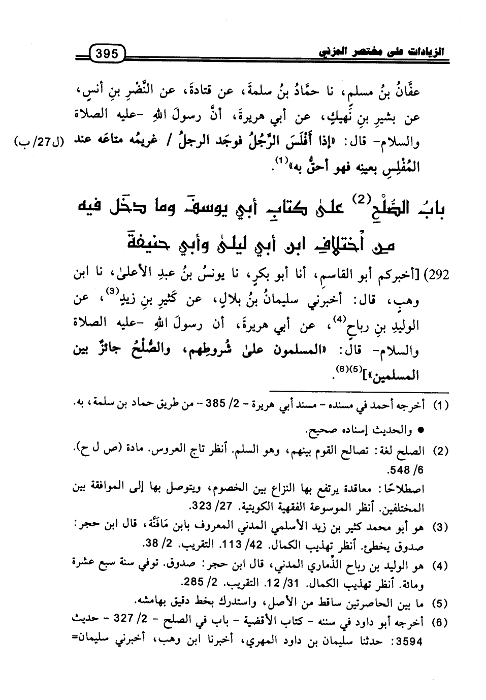 292 - أَخْبَرَكُمْ أَبُو الْقَاسِمِ، أنا أَبُو بَكْرٍ، نا يُونُسُ بْنُ عَبْدِ الأَعْلَى، نا ابْنُ وَهْبٍ، قَالَ: أَخْبَرَنِي سُلَيْمَانُ بْنُ بِلالٍ، عَنْ كَثِيرِ بْنِ زَيْدٍ، عَنِ الْوَلِيدِ بْنِ رَبَاحٍ، عَنْ أَبِي هُرَيْرَةَ، أَنَّ رَسُولَ اللَّهِ، عَلَيْهِ الصَّلاةُ وَالسَّلامُ، قَالَ: «الْمُسْلِمُونَ عَلَى شُرُوطِهِمْ، وَالصُّلْحُ جَائِزٌ بَيْنَ الْمُسْلِمِينَ»