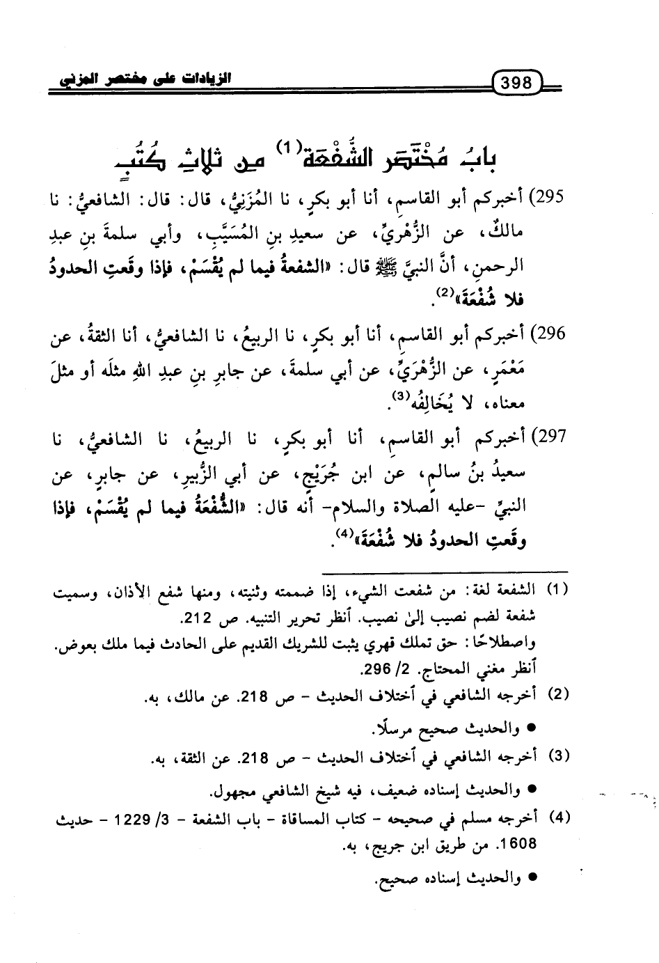 295 - أَخْبَرَكُمْ أَبُو الْقَاسِمِ، أنا أَبُو بَكْرٍ، نا الْمُزَنِيُّ، قَالَ: قَالَ الشَّافِعِيُّ: نا مَالِكٌ، عَنِ الزُّهْرِيِّ، عَنْ سَعِيدِ بْنِ الْمُسَيِّبِ، وَأَبِي سَلَمَةَ بْنِ عَبْدِ الرَّحْمَنِ، أَنَّ النَّبِيَّ صَلَّى اللَّهُ عَلَيْهِ وَسَلَّمَ، قَالَ: «الشُّفْعَةُ فِيمَا لَمْ يُقْسَمْ، فَإِذَا وَقَعَتِ الْحُدُودُ فَلا شُفْعَةَ» .