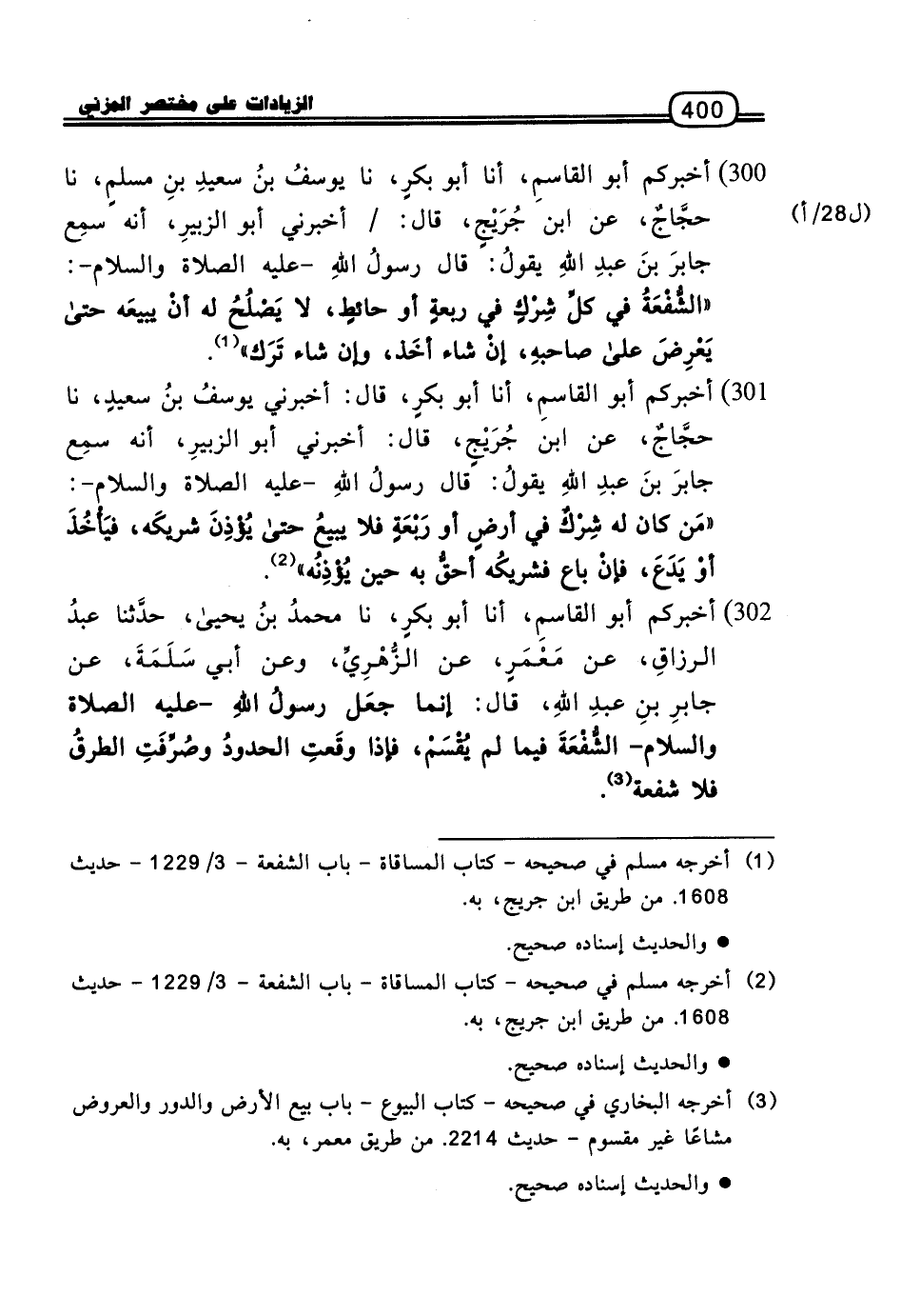 301 - أَخْبَرَكُمْ أَبُو الْقَاسِمِ، أنا أَبُو بَكْرٍ، قَالَ: أَخْبَرَنِي يُوسُفُ بْنُ سَعِيدٍ، نا حَجَّاجٌ، عَنِ ابْنِ جُرَيْجٍ، قَالَ: أَخْبَرَنِي أَبُو الزُّبَيْرِ، أَنَّهُ سَمِعَ جَابِرَ بْنَ عَبْدِ اللَّهِ يَقُولُ: قَالَ رَسُولُ اللَّهِ، عَلَيْهِ الصَّلاةُ وَالسَّلامُ: «مَنْ كَانَ لَهُ شِرْكٌ فِي أَرْضٍ أَوْ رَبْعَةٍ فَلا يَبِيعُ حَتَّى يُؤْذِنَ شَرِيكَهُ، فَيَأْخُذَ أَوْ يَدَعَ، فَإِنْ بَاعَ فَشَرِيكُهُ أَحَقُّ بِهِ حِينَ يُؤْذِنُهُ»