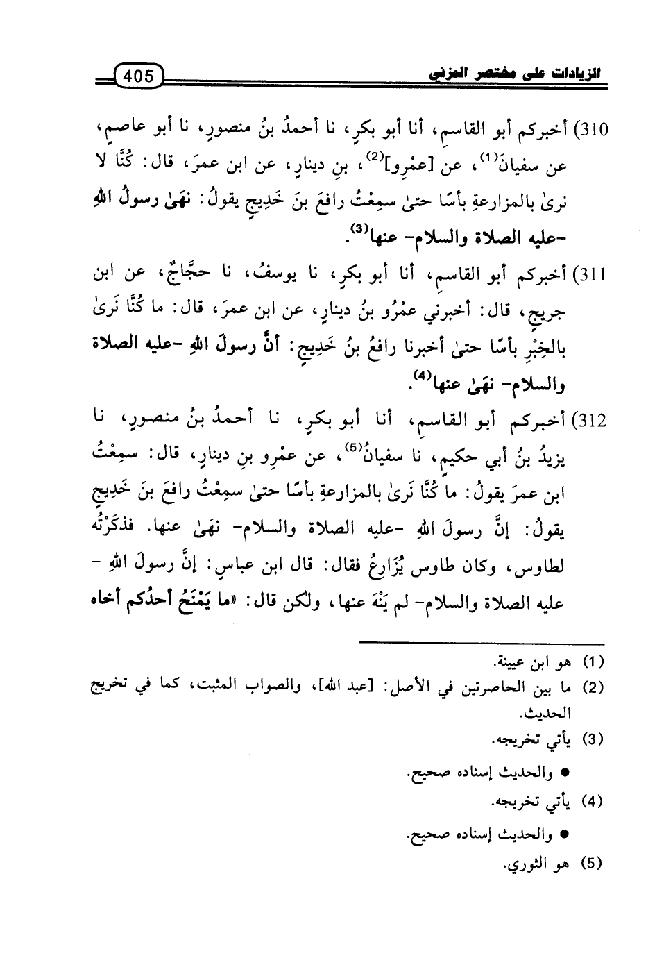 310 - أَخْبَرَكُمْ أَبُو الْقَاسِمِ، أنا أَبُو بَكْرٍ، نا أَحْمَدُ بْنُ مَنْصُورٍ، نا أَبُو عَاصِمٍ، عَنْ سُفْيَانَ، عَنْ عَمْرِو بْنِ دِينَارٍ، عَنِ ابْنِ عُمَرَ، قَالَ: كُنَّا لا نَرَى بِالْمُزَارَعَةِ بَأْسًا حَتَّى سَمِعْتُ رَافِعَ بْنَ خَدِيجٍ يَقُولُ: نَهَى رَسُولُ اللَّهِ، عَلَيْهِ الصَّلاةُ وَالسَّلامُ، عَنْهَا