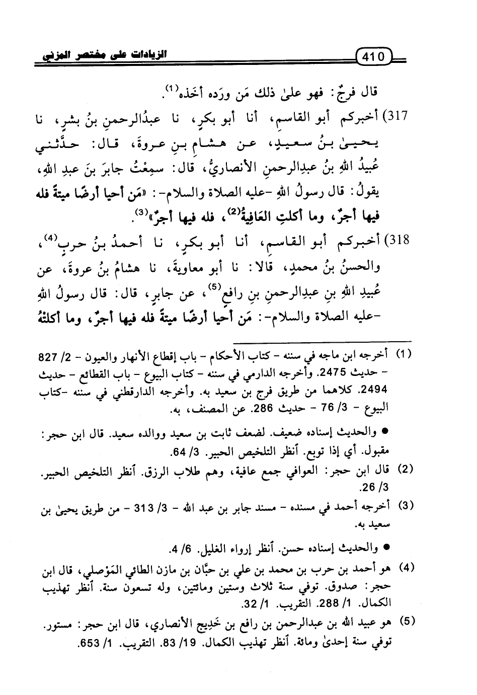 318 - أَخْبَرَكُمْ أَبُو الْقَاسِمِ، أنا أَبُو بَكْرٍ، نا أَحْمَدُ بْنُ حَرْبٍ، وَالْحَسَنُ بْنُ مُحَمَّدٍ، قَالا: نا أَبُو مُعَاوِيَةَ، نا هِشَامُ بْنُ عُرْوَةَ، عَنْ عُبَيْدِ اللَّهِ بْنِ عَبْدِ الرَّحْمَنِ بْنِ رَافِعٍ، عَنْ جَابِرٍ، قَالَ: قَالَ رَسُولُ اللَّهِ، عَلَيْهِ الصَّلاةُ وَالسَّلامُ: مَنْ أَحْيَا أَرْضًا مَيِّتَةً فَلَهُ فِيهَا أَجْرٌ، وَمَا أَكَلَتْهُ