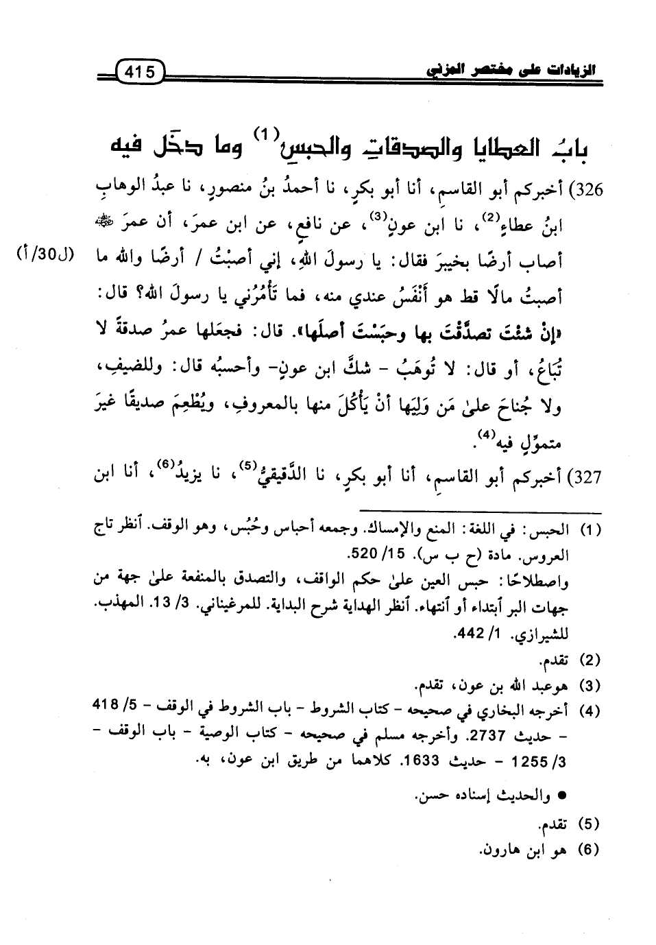 326 - أَخْبَرَكُمْ أَبُو الْقَاسِمِ، أنا أَبُو بَكْرٍ، نا أَحْمَدُ بْنُ مَنْصُورٍ، نا عَبْدُ الْوَهَّابِ بْنُ عَطَاءٍ، نا ابْنُ عَوْنٍ، عَنْ نَافِعٍ، عَنِ ابْنِ عُمَرَ، أَنَّ عُمَرَ رَضِيَ اللَّهُ عَنْهُ أَصَابَ أَرْضًا بِخَيْبَرَ، فَقَالَ: يَا رَسُولَ اللَّهِ، إِنِّي أَصَبْتُ أَرْضًا، وَاللَّهِ مَا أَصَبْتُ مَالا قَطُّ هُوَ أَنْفَسُ عِنْدِي مِنْهُ، فَمَا تَأْمُرُنِي يَا رَسُولَ اللَّهِ؟ قَالَ: «إِنْ شِئْتَ تَصَدَّقْتَ بِهَا وَحَبَسْتَ أَصْلَهَا» .