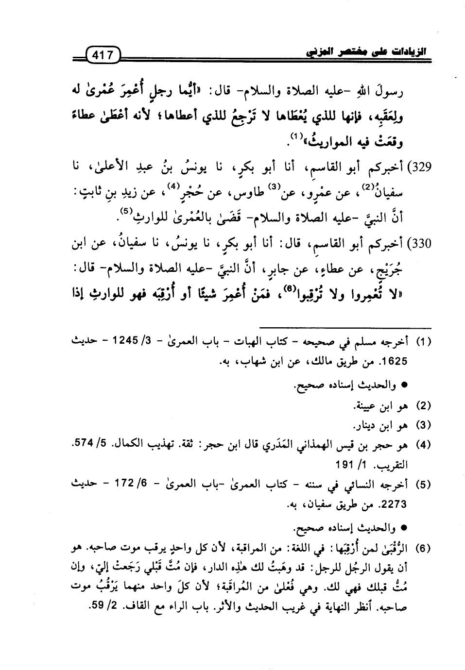 329 - أَخْبَرَكُمْ أَبُو الْقَاسِمِ، أنا أَبُو بَكْرٍ، نا يُونُسُ بْنُ عَبْدِ الأَعْلَى، نا سُفْيَانُ، عَنْ عَمْرٍو، عَنْ طَاوُسٍ، عَنْ حُجْرٍ، عَنْ زَيْدِ بْنِ ثَابِتٍ: أَنَّ النَّبِيَّ، عَلَيْهِ الصَّلاةُ وَالسَّلامُ، قَضَى بِالْعُمْرَى لِلْوَارِثِ