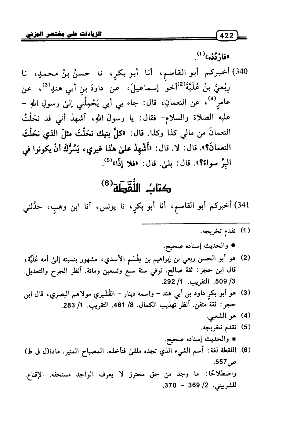 340 - أَخْبَرَكُمْ أَبُو الْقَاسِمِ، أنا أَبُو بَكْرٍ، نا حَسَنُ بْنُ مُحَمَّدٍ، نا رِبْعِيُّ ابْنُ عُلَيَّةَ أَخُو إِسْمَاعِيلَ، عَنْ دَاوُدَ بْنِ أَبِي هِنْدٍ، عَنْ عَامِرٍ، عَنِ النُّعْمَانِ، قَالَ: جَاءَ بِي أَبِي يَحْمِلُنِي إِلَى رَسُولِ اللَّهِ، عَلَيْهِ الصَّلاةُ وَالسَّلامُ، فَقَالَ: يَا رَسُولَ اللَّهِ، أَشْهَدُ أَنِّي قَدْ نَحَلْتُ النُّعْمَانَ مِنْ مَالِي كَذَا وَكَذَا.