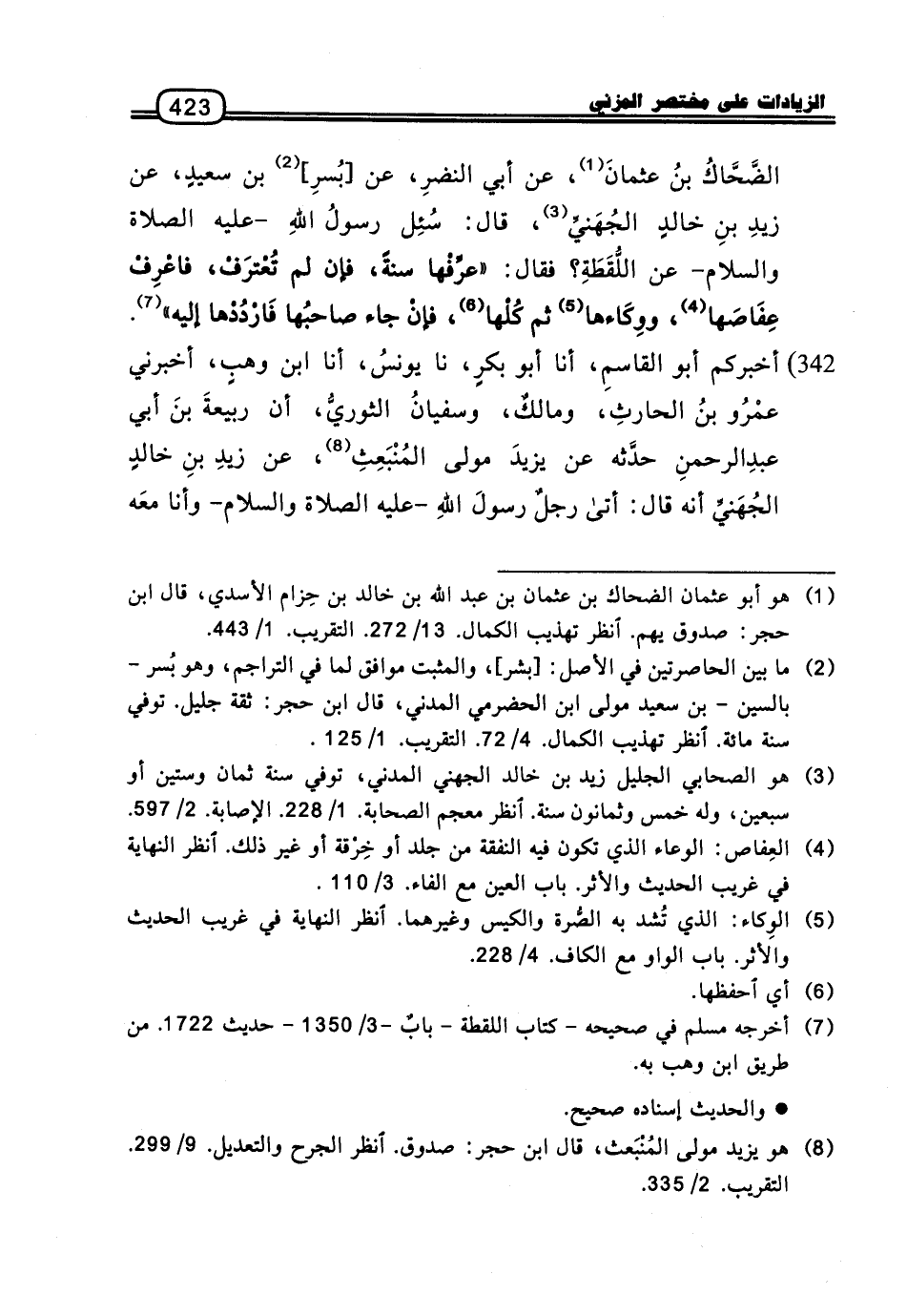الضَّحَّاكُ بْنُ عُثْمَانَ، عَنْ أَبِي النَّضْرِ، عَنْ بُسْرِ بْنِ سَعِيدٍ، عَنْ زَيْدِ بْنِ خَالِدٍ الْجُهَنِيِّ، قَالَ: سُئِلَ رَسُولُ اللَّهِ، عَلَيْهِ الصَّلاةُ وَالسَّلامُ، عَنِ اللُّقَطَةِ؟ فَقَالَ: «عَرِّفْهَا سَنَةً، فَإِنْ لَمْ تُعْتَرَفْ، فَاعْرِفْ عِفَاصَهَا، وَوِكَاءَهَا، ثُمَّ كُلْهَا، فَإِنْ جَاءَ صَاحِبُهَا فَارْدُدْهَا إِلَيْهِ»