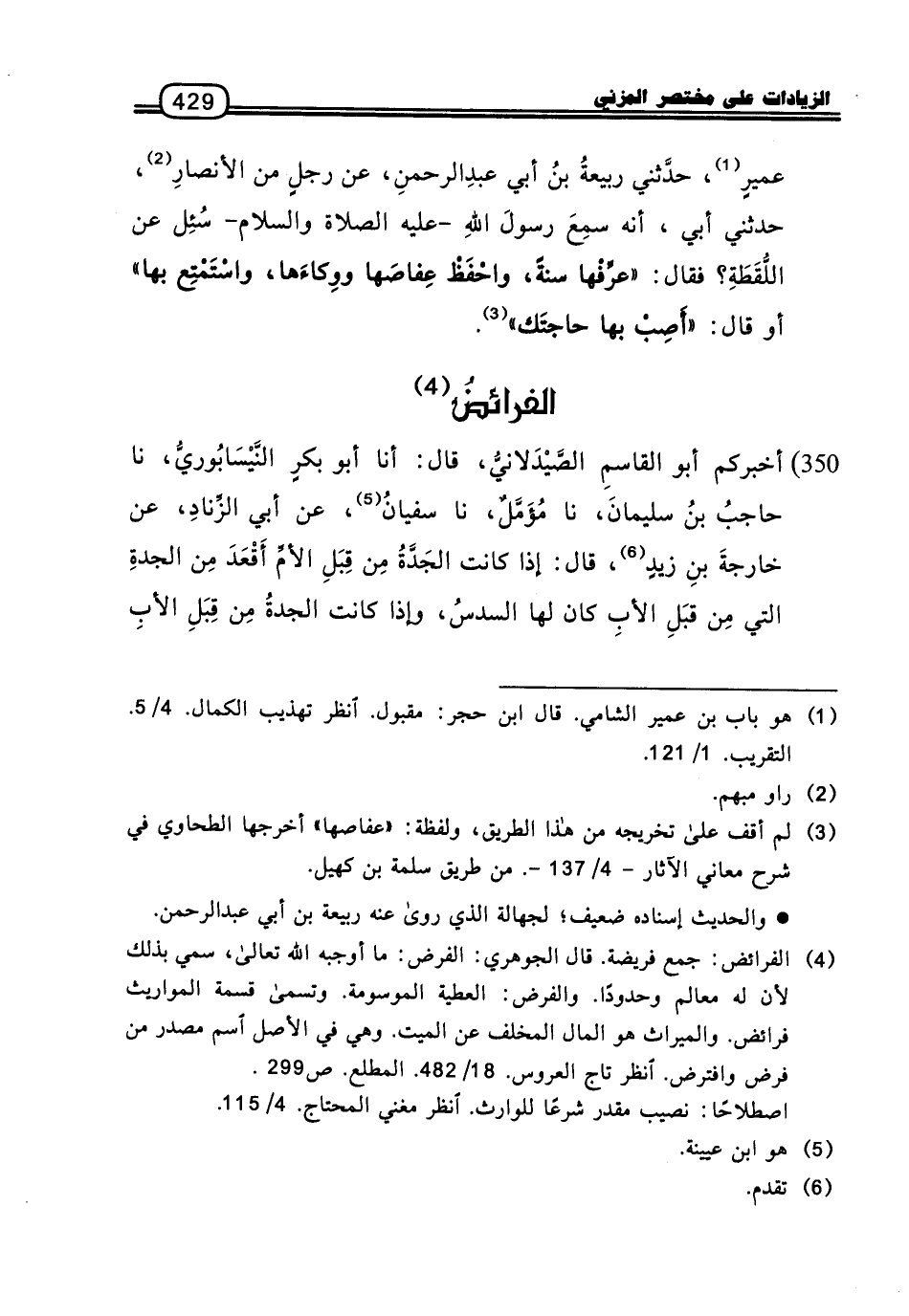 350 - أَخْبَرَكُمْ أَبُو الْقَاسِمِ الصَّيْدَلانِيُّ، قَالَ: أنا أَبُو بَكْرٍ النَّيْسَابُورِيُّ، نا حَاجِبُ بْنُ سُلَيْمَانَ، نا مُؤَمَّلٌ، نا سُفْيَانُ، عَنْ أَبِي الزِّنَادِ، عَنْ خَارِجَةَ بْنِ زَيْدٍ، قَالَ: إِذَا كَانَتِ الْجَدَّةُ مِنْ قِبَلِ الأُمِّ أَقْعَدَ مِنَ الْجَدَّةِ الَّتِي مِنْ قِبَلِ الأَبِ كَانَ لَهَا السُّدُسُ، وَإِذَا كَانَتِ الْجَدَّةُ مِنْ قِبَلِ الأَبِ