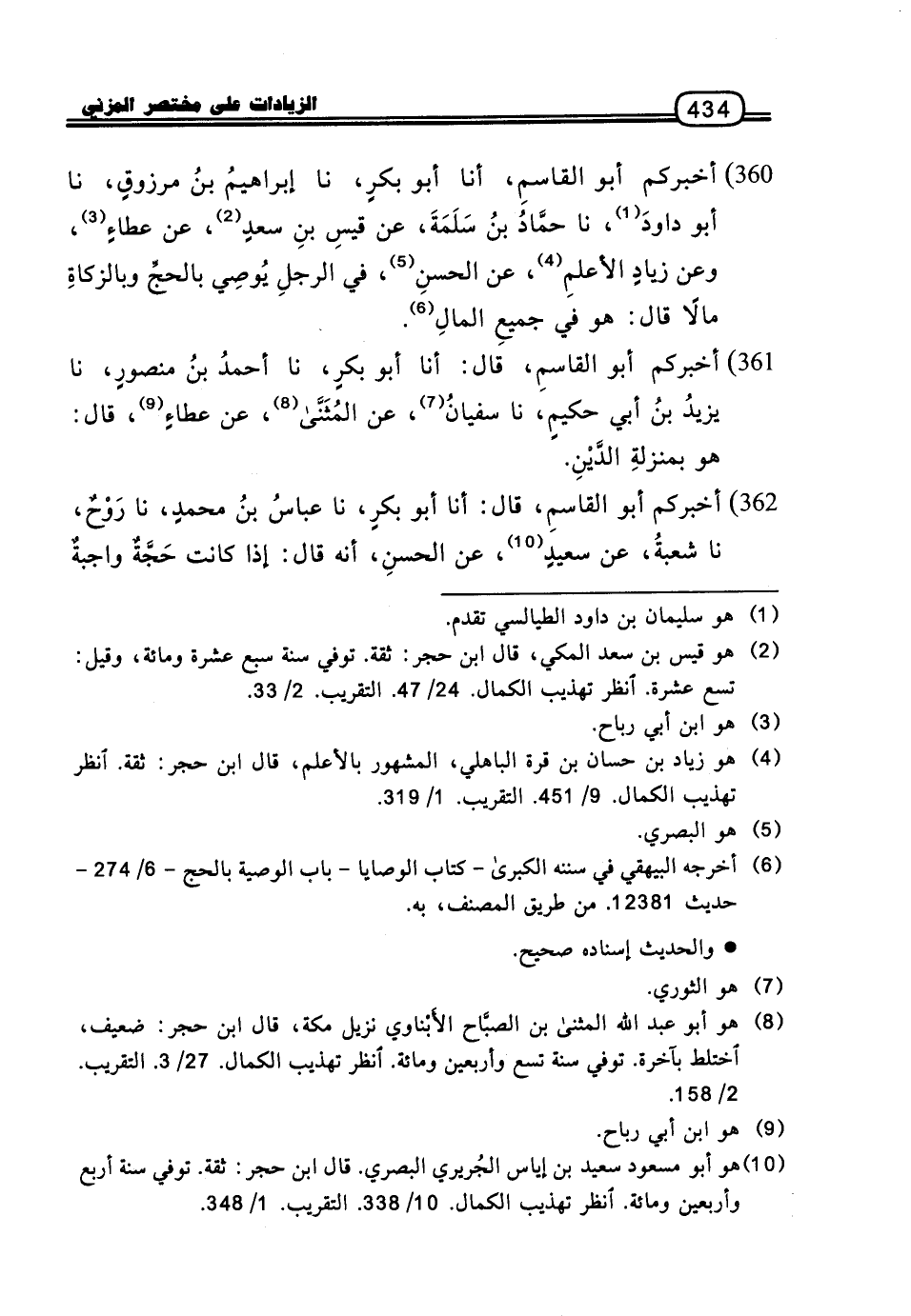 360 - أَخْبَرَكُمْ أَبُو الْقَاسِمِ، أنا أَبُو بَكْرٍ، نا إِبْرَاهِيمُ بْنُ مَرْزُوقٍ، نا أَبُو دَاوُدَ، نا حَمَّادُ بْنُ سَلَمَةَ، عَنْ قَيْسِ بْنِ سَعْدٍ، عَنْ عَطَاءٍ، وَعَنْ زِيَادٍ الأَعْلَمِ، عَنِ الْحَسَنِ، فِي الرَّجُلِ يُوصِي بِالْحَجِّ وَبِالزَّكَاةِ مَالا، قَالَ: هُوَ فِي جَمِيعِ الْمَالِ