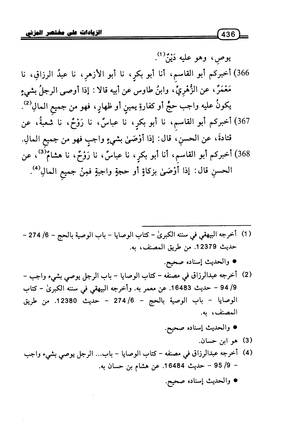 368 - أَخْبَرَكُمْ أَبُو الْقَاسِمِ، أنا أَبُو بَكْرٍ، نا عَبَّاسٌ، نا رَوْحٌ، نا هِشَامٌ، عَنِ الْحَسَنِ، قَالَ: إِذَا أَوْصَى بِزَكَاةٍ أَوْ حَجَّةٍ وَاجِبَةٍ فَمِنْ جَمِيعِ الْمَالِ