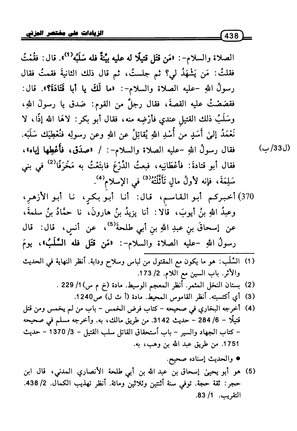 370 - أَخْبَرَكُمْ أَبُو الْقَاسِمِ، قَالَ: أنا أَبُو بَكْرٍ، نا أَبُو الأَزْهَرِ، وَعَبْدُ اللَّهِ بْنُ أَيُّوبَ، قَالا: أنا يَزِيدُ بْنُ هَارُونَ، نا حَمَّادُ بْنُ سَلَمَةَ، عَنْ إِسْحَاقَ بْنِ عَبْدِ اللَّهِ بْنِ أَبِي طَلْحَةَ، عَنْ أَنَسٍ، قَالَ: قَالَ رَسُولُ اللَّهِ، عَلَيْهِ الصَّلاةُ وَالسَّلامُ: «مَنْ قَتَلَ فَلَهُ السَّلَبُ» ، يَوْمَ
