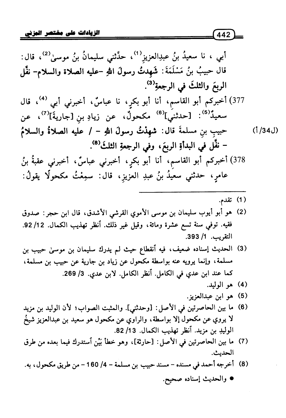 377 - أَخْبَرَكُمْ أَبُو الْقَاسِمِ، أنا أَبُو بَكْرٍ، نا عَبَّاسٌ، أَخْبَرَنِي أَبِي، قَالَ سَعِيدٌ: حَدَّثَنِي مَكْحُولٌ، عَنْ زِيَادِ بْنِ جَارِيَةَ، عَنْ حَبِيبِ بْنِ مَسْلَمَةَ، قَالَ: شَهِدْتُ رَسُولَ اللَّهِ، عَلَيْهِ الصَّلاةُ وَالسَّلامُ، نَفَّلَ فِي الْبَدْأَةِ الرُّبُعَ، وَفِي الرَّجْعَةِ الثُّلُثَ