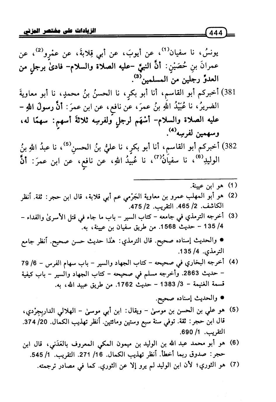 382 - أَخْبَرَكُمْ أَبُو الْقَاسِمِ، أنا أَبُو بَكْرٍ، نا عَلِيُّ بْنُ الْحَسَنِ، نا عَبْدُ اللَّهِ بْنُ الْوَلِيدِ، نا سُفْيَانُ، نا عُبَيْدُ اللَّهِ، عَنْ نَافِعٍ، عَنِ ابْنِ عُمَرَ: أَنَّ
