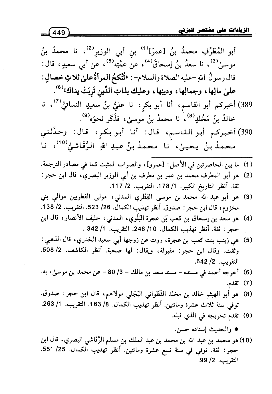 أَبُو الْمُطَرِّفِ مُحَمَّدُ بْنُ عُمَرَ بْنِ أَبِي الْوَزِيرِ، نا مُحَمَّدُ بْنُ مُوسَى، نا سَعْدُ بْنُ إِسْحَاقَ، عَنْ عَمَّتِهِ، عَنْ أَبِي سَعِيدٍ، قَالَ: قَالَ رَسُولُ اللَّهِ، عَلَيْهِ الصَّلاةُ وَالسَّلامُ: " تُنْكَحُ الْمَرْأَةُ عَلَى ثَلاثِ خِصَالٍ: عَلَى مَالِهَا، وَجَمَالِهَا، وَدِينِهَا، وَعَلَيْكَ بِذَاتِ الدِّينِ تَرِبَتْ يَدَاكَ ".