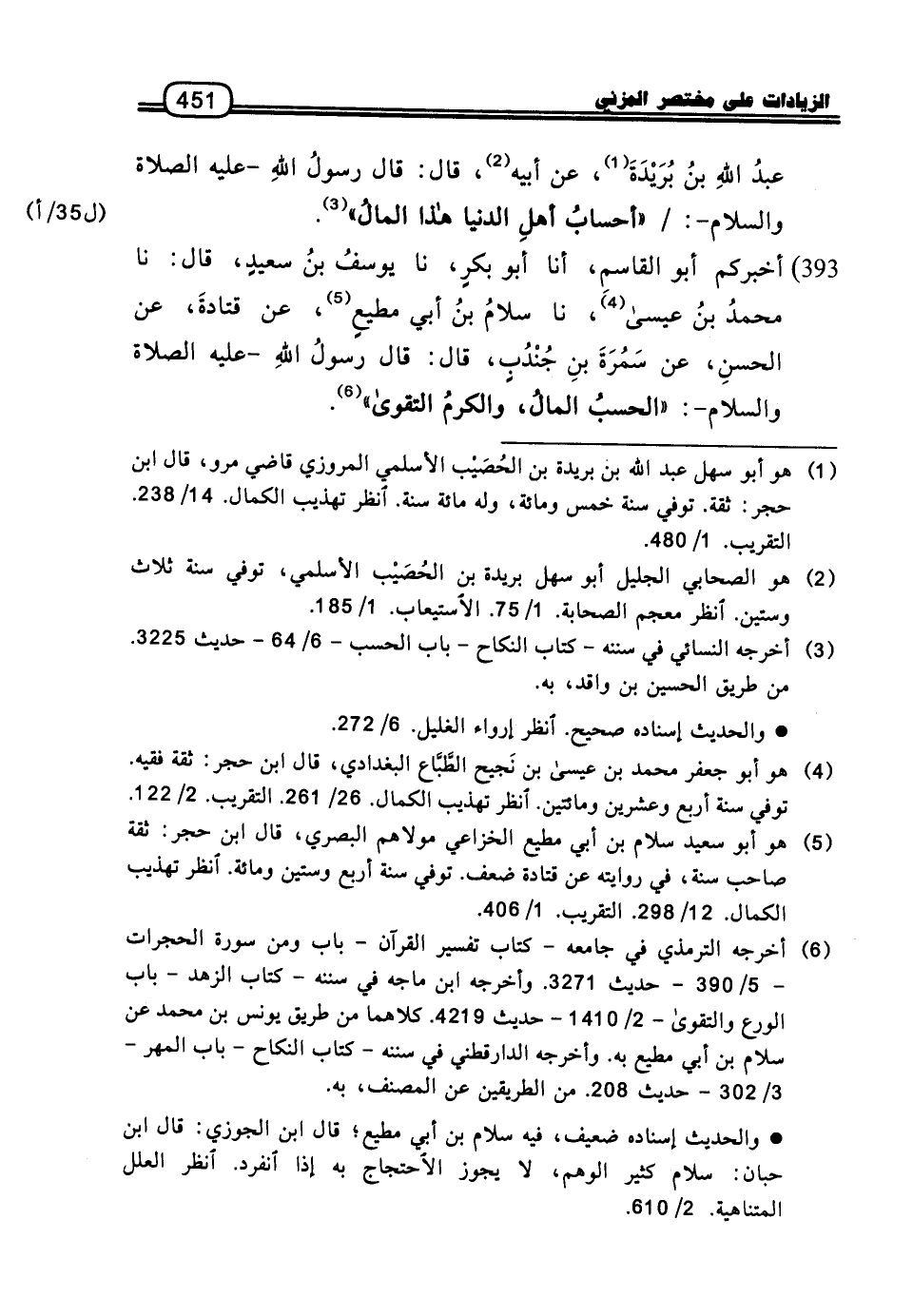 عَبْدُ اللَّهِ بْنُ بُرَيْدَةَ، عَنْ أَبِيهِ، قَالَ: قَالَ رَسُولُ اللَّهِ، عَلَيْهِ الصَّلاةُ وَالسَّلامُ: «أَحْسَابُ أَهْلِ الدُّنْيَا هَذَا الْمَالُ»