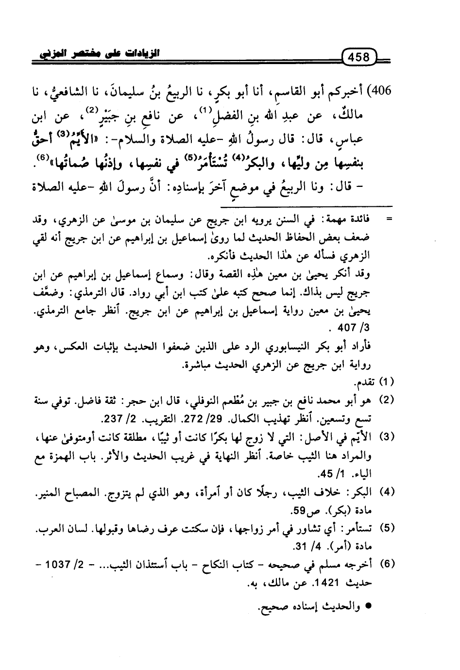 406 - أَخْبَرَكُمْ أَبُو الْقَاسِمِ، أنا أَبُو بَكْرٍ، نا الرَّبِيعُ بْنُ سُلَيْمَانَ، نا الشَّافِعِيُّ، نا مَالِكٌ، عَنْ عَبْدِ اللَّهِ بْنِ الْفَضْلِ، عَنْ نَافِعِ بْنِ جُبَيْرٍ، عَنِ ابْنِ عَبَّاسٍ، قَالَ: قَالَ رَسُولُ اللَّهِ، عَلَيْهِ الصَّلاةُ وَالسَّلامُ: «الأَيِّمُ أَحَقُّ بِنَفْسِهَا مِنْ وَلِيِّهَا، وَالْبِكْرُ تُسْتَأْمَرُ فِي نَفْسِهَا، وَإِذْنُهَا صُمَاتُهَا»