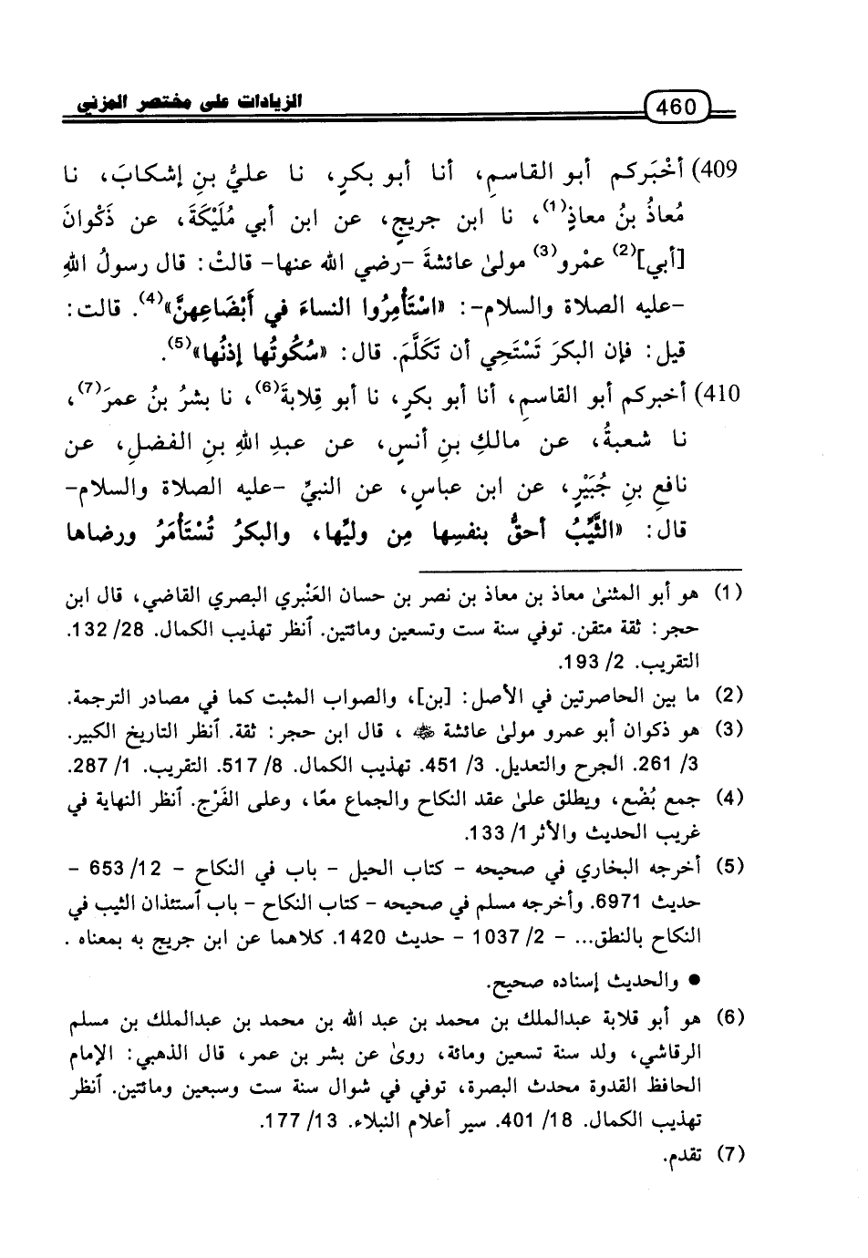 409 - أَخْبَرَكُمْ أَبُو الْقَاسِمِ، أنا أَبُو بَكْرٍ، نا عَلِيُّ بْنُ إِشْكَابَ، نا مُعَاذُ بْنُ مُعَاذٍ، نا ابْنُ جُرَيْجٍ، عَنِ ابْنِ أَبِي مُلَيْكَةَ، عَنْ ذَكْوَانَ أَبِي عَمْرٍو مَوْلَى عَائِشَةَ، رَضِيَ اللَّهُ عَنْهَا، قَالَتْ: قَالَ رَسُولُ اللَّهِ، عَلَيْهِ الصَّلاةُ وَالسَّلامُ: «اسْتَأْمِرُوا النِّسَاءَ فِي أَبْضَاعِهِنَّ» .