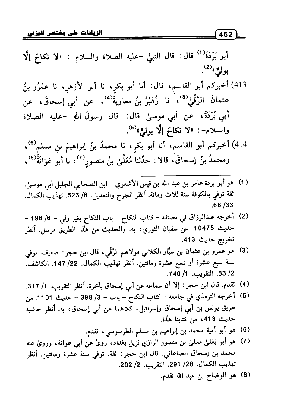413 - أَخْبَرَكُمْ أَبُو الْقَاسِمِ، قَالَ: أنا أَبُو بَكْرٍ، نا أَبُو الأَزْهَرِ، نا عَمْرُو بْنُ عُثْمَانَ الرَّقِّيُّ، نا زُهَيْرُ بْنُ مُعَاوِيَةَ، عَنْ أَبِي إِسْحَاقَ، عَنْ أَبِي بُرْدَةَ، عَنْ أَبِي مُوسَى قَالَ: قَالَ رَسُولُ اللَّهِ، عَلَيْهِ الصَّلاةُ وَالسَّلامُ: «لا نِكَاحَ إِلا بِوَلِيٍّ»