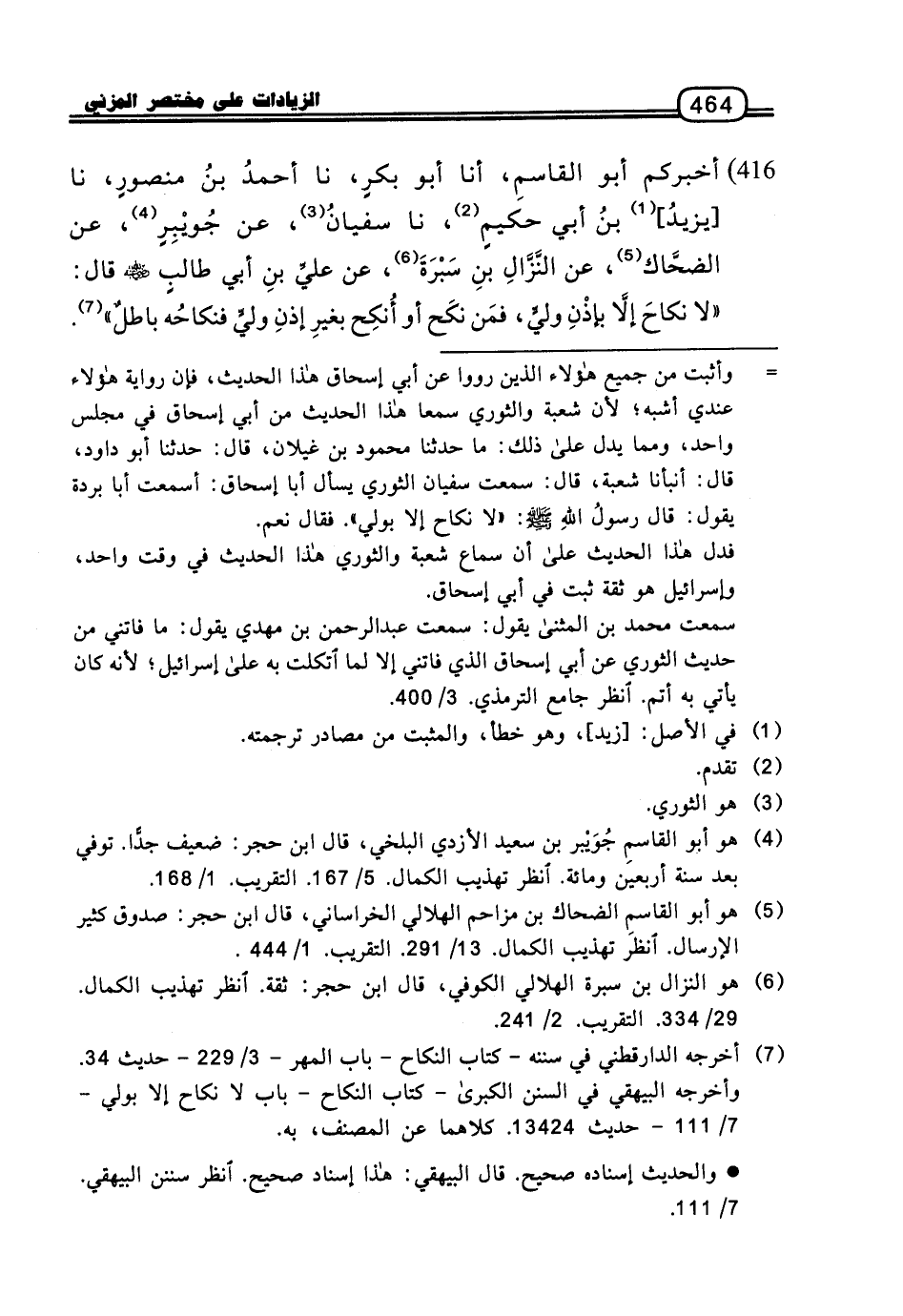 416 - أَخْبَرَكُمْ أَبُو الْقَاسِمِ، أنا أَبُو بَكْرٍ، نا أَحْمَدُ بْنُ مَنْصُورٍ، نا يَزِيدُ بْنُ أَبِي حَكِيمٍ، نا سُفْيَانُ، عَنْ جُوَيْبِرٍ، عَنِ الضَّحَّاكِ، عَنِ النَّزَّالِ بْنِ سَبْرَةَ، عَنْ عَلِيِّ بْنِ أَبِي طَالِبٍ رَضِيَ اللَّهُ عَنْهُ قَالَ: «لا نِكَاحَ إِلا بِإِذْنِ وَلِيٍّ، فَمَنْ نَكَحَ أَوْ أُنْكِحَ بِغَيْرِ إِذْنِ وَلِيٍّ فَنِكَاحُهُ بَاطِلٌ»