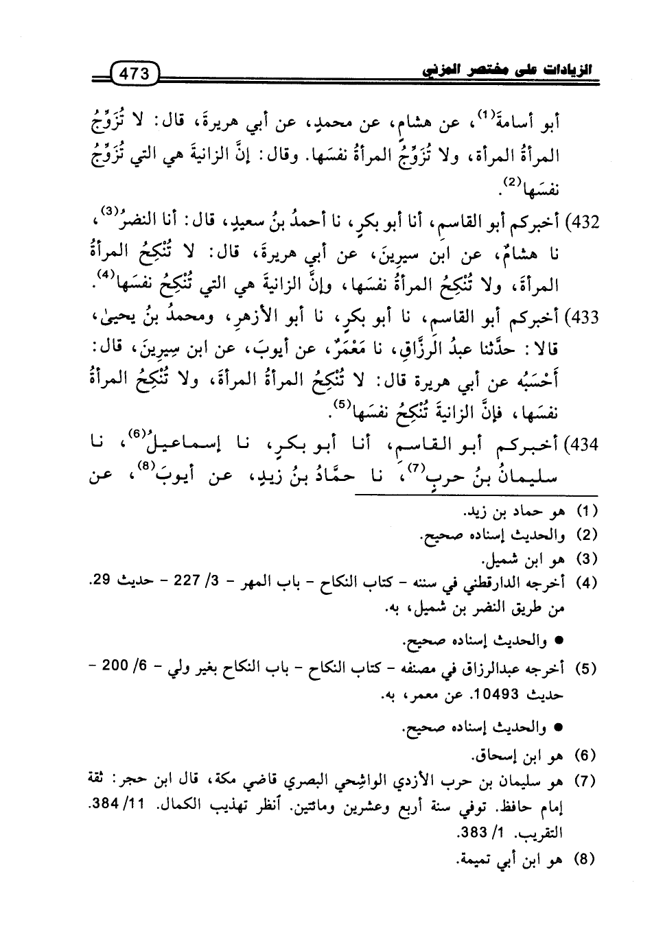 432 - أَخْبَرَكُمْ أَبُو الْقَاسِمِ، أنا أَبُو بَكْرٍ، نا أَحْمَدُ بْنُ سَعِيدٍ، قَالَ: أنا النَّضْرُ، نا هِشَامٌ، عَنِ ابْنِ سِيرِينَ، عَنْ أَبِي هُرَيْرَةَ، قَالَ: لا تُنْكِحُ الْمَرْأَةُ الْمَرْأَةَ، وَلا تُنْكِحُ الْمَرْأَةُ نَفْسَهَا، وَإِنَّ الزَّانِيَةَ هِيَ الَّتِي تُنْكِحُ نَفْسَهَا