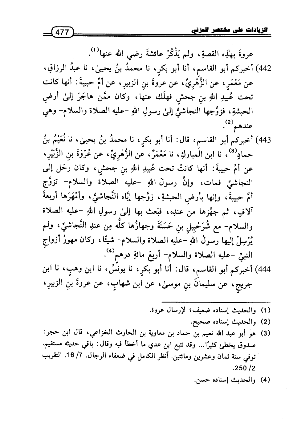 443 - أَخْبَرَكُمْ أَبُو الْقَاسِمِ، قَالَ: أنا أَبُو بَكْرٍ، نا مُحَمَّدُ بْنُ يَحْيَى، نا نُعَيْمُ بْنُ حَمَّادٍ، نا ابْنُ الْمُبَارَكِ، نا مَعْمَرٌ، عَنِ الزُّهْرِيِّ، عَنْ عُرْوَةَ بْنِ الزُّبَيْرِ، عَنْ أُمِّ حَبِيبَةَ: أَنَّهَا كَانَتْ تَحْتَ عُبَيْدِ اللَّهِ بْنِ جَحْشٍ، وَكَانَ رَحَلَ إِلَى النَّجَاشِيِّ، فَمَاتَ، وَإِنَّ رَسُولَ اللَّهِ، عَلَيْهِ الصَّلاةُ وَالسَّلامُ، تَزَوَّجَ أُمَّ حَبِيبَةَ، وَإِنَّهَا بِأَرْضِ الْحَبَشَةِ، زَوَّجَهَا إِيَّاهُ النَّجَاشِيُّ، وَأَمْهَرَهَا أَرْبَعَةَ آلافٍ، ثُمَّ جَهَّزَهَا مِنْ عِنْدِهِ، فَبَعَثَ بِهَا إِلَى رَسُولِ اللَّهِ، عَلَيْهِ الصَّلاةُ وَالسَّلامُ، مَعَ شُرَحْبِيلَ ابْنِ حَسَنَةَ وَجَهَازُهَا كُلُّهُ مِنْ عِنْدِ النَّجَاشِيِّ، وَلَمْ يُرْسِلْ إِلَيْهَا رَسُولُ اللَّهِ، عَلَيْهِ الصَّلاةُ وَالسَّلامُ، شَيْئًا، وَكَانَ مُهُورُ أَزْوَاجِ النَّبِيِّ، عَلَيْهِ الصَّلاةُ وَالسَّلامُ، أَرْبَعَ مِائَةِ دِرْهَمٍ