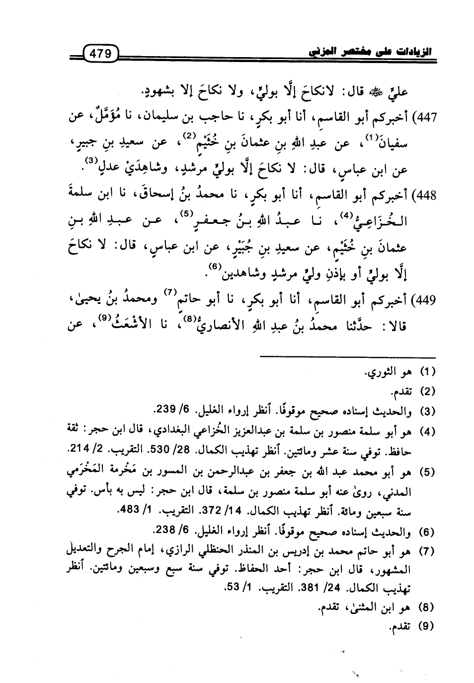 447 - أَخْبَرَكُمْ أَبُو الْقَاسِمِ، أنا أَبُو بَكْرٍ، نا حَاجِبُ بْنُ سُلَيْمَانَ، نا مُؤَمَّلٌ، عَنْ سُفْيَانَ، عَنْ عَبْدِ اللَّهِ بْنِ عُثْمَانَ بْنِ خُثَيْمٍ، عَنْ سَعِيدِ بْنِ جُبَيْرٍ، عَنِ ابْنِ عَبَّاسٍ، قَالَ: لا نِكَاحَ إِلا بِوَلِيٍّ مُرْشِدٍ، وَشَاهِدَيْ عَدْلٍ