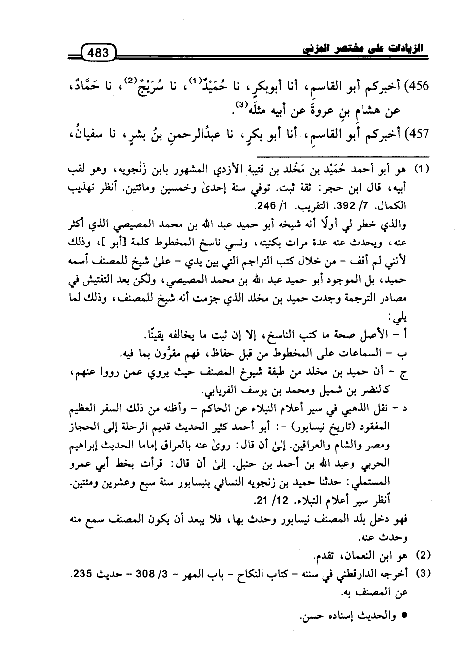 456 - أَخْبَرَكُمْ أَبُو الْقَاسِمِ، أنا أَبُو بَكْرٍ، نا حُمَيْدٌ، نا سُرَيْجٌ، نا حَمَّادٌ، عَنْ هِشَامِ بْنِ عُرْوَةَ، عَنْ أَبِيهِ مِثْلَهُ