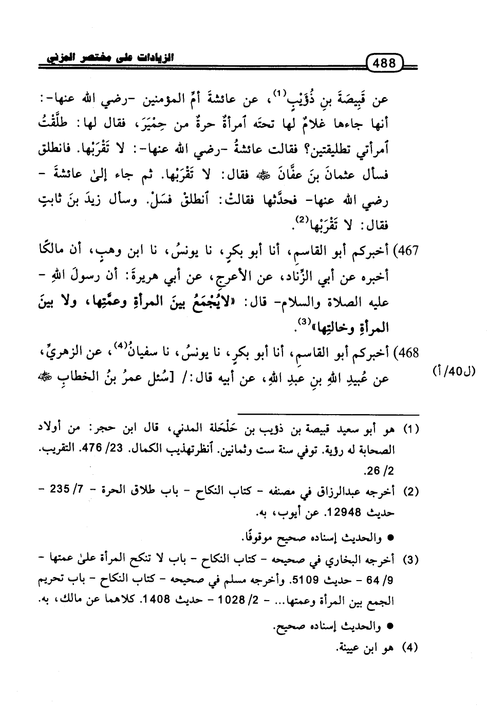 467 - أَخْبَرَكُمْ أَبُو الْقَاسِمِ، أنا أَبُو بَكْرٍ، نا يُونُسُ، نا ابْنُ وَهْبٍ، أَنَّ مَالِكًا أَخْبَرَهُ عَنْ أَبِي الزِّنَادِ، عَنِ الأَعْرَجِ، عَنْ أَبِي هُرَيْرَةَ: أَنَّ رَسُولَ اللَّهِ، عَلَيْهِ الصَّلاةُ وَالسَّلامُ، قَالَ: «لا يُجْمَعُ بَيْنَ الْمَرْأَةِ وَعَمَّتِهَا، وَلا بَيْنَ الْمَرْأَةِ وَخَالَتِها»