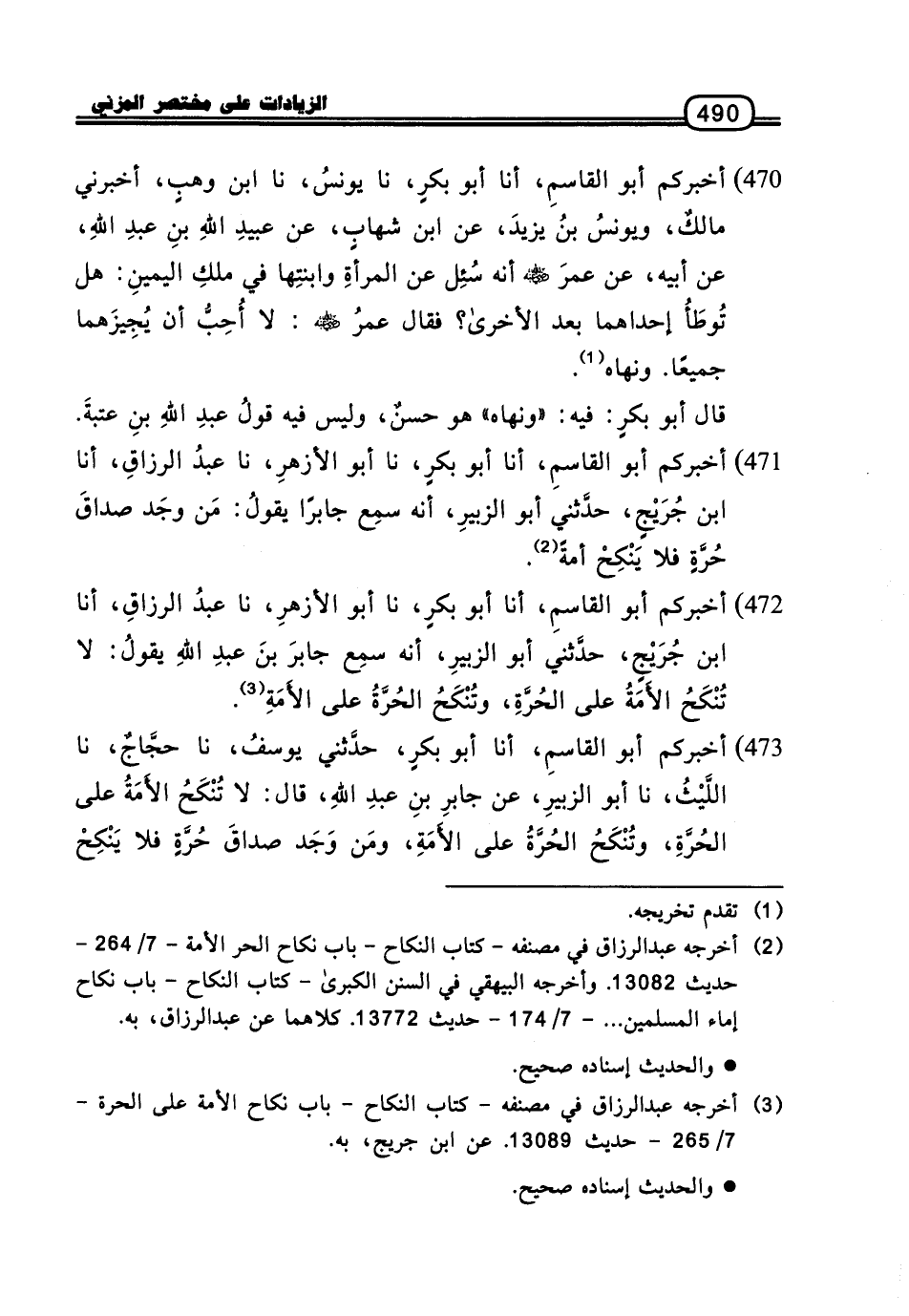 472 - أَخْبَرَكُمْ أَبُو الْقَاسِمِ، أنا أَبُو بَكْرٍ، نا أَبُو الأَزْهَرِ، نا عَبْدُ الرَّزَّاقِ، أنا ابْنُ جُرَيْجٍ، حَدَّثَنِي أَبُو الزُّبَيْرِ، أَنَّهُ سَمِعَ جَابِرَ بْنَ عَبْدِ اللَّهِ يَقُولُ: لا تُنْكَحُ الأَمَةُ عَلَى الْحُرَّةِ، وَتُنْكَحُ الْحُرَّةُ عَلَى الأَمَةِ