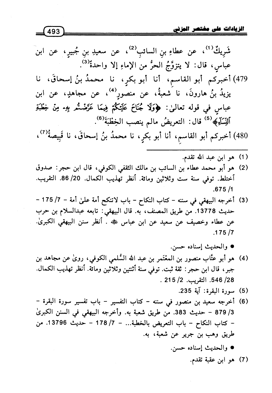479 - أَخْبَرَكُمْ أَبُو الْقَاسِمِ، أنا أَبُو بَكْرٍ، نا مُحَمَّدُ بْنُ إِسْحَاقَ، نا يَزِيدُ بْنُ هَارُونَ، نا شُعْبَةُ، عَنْ مَنْصُورٍ، عَنْ مُجَاهِدٍ، عَنِ ابْنِ عَبَّاسٍ فِي قَوْلِهِ تَعَالَى: {وَلا جُنَاحَ عَلَيْكُمْ فِيمَا عَرَّضْتُمْ بِهِ مِنْ خِطْبَةِ النِّسَاءِ} [البقرة: 235] قَالَ: التَّعْرِيضُ مَا لَمْ يَنْصِبِ الْخِطْبَةَ