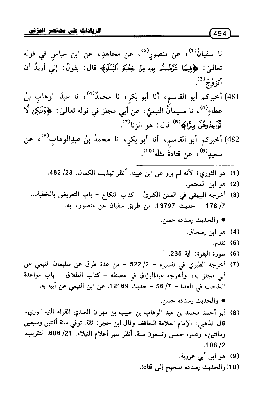 481 - أَخْبَرَكُمْ أَبُو الْقَاسِمِ، أنا أَبُو بَكْرٍ، نا مُحَمَّدٌ، نا عَبْدُ الْوَهَّابِ بْنُ عَطَاءٍ، نا سُلَيْمَان التَّيْمِيُّ، عَنْ أَبِي مِجْلَزٍ فِي قَوْلِهِ تَعَالَى: {وَلَكِنْ لا تُوَاعِدُوهُنَّ سِرًّا} [البقرة: 235] قَالَ: هُوَ الزِّنَا.