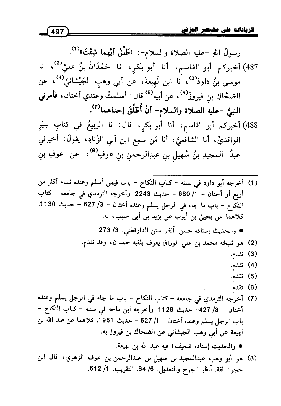 487 - أَخْبَرَكُمْ أَبُو الْقَاسِمِ، أنا أَبُو بَكْرٍ، نا حَمْدَانُ بْنُ عَلِيٍّ، نا مُوسَى بْنُ دَاوُدَ، نا ابْنُ لَهِيعَةَ، عَنْ أَبِي وَهْبٍ الْجَيْشَانِيِّ، عَنِ الضَّحَّاكِ بْنِ فَيْرُوزَ، عَنْ أَبِيهِ، قَالَ: أَسْلَمْتُ وَعِنْدِي أُخْتَانِ، «فَأَمَرَنِي النَّبِيُّ، عَلَيْهِ الصَّلاةُ وَالسَّلامُ، أَنْ أُطَلِّقَ إِحْدَاهُمَا»