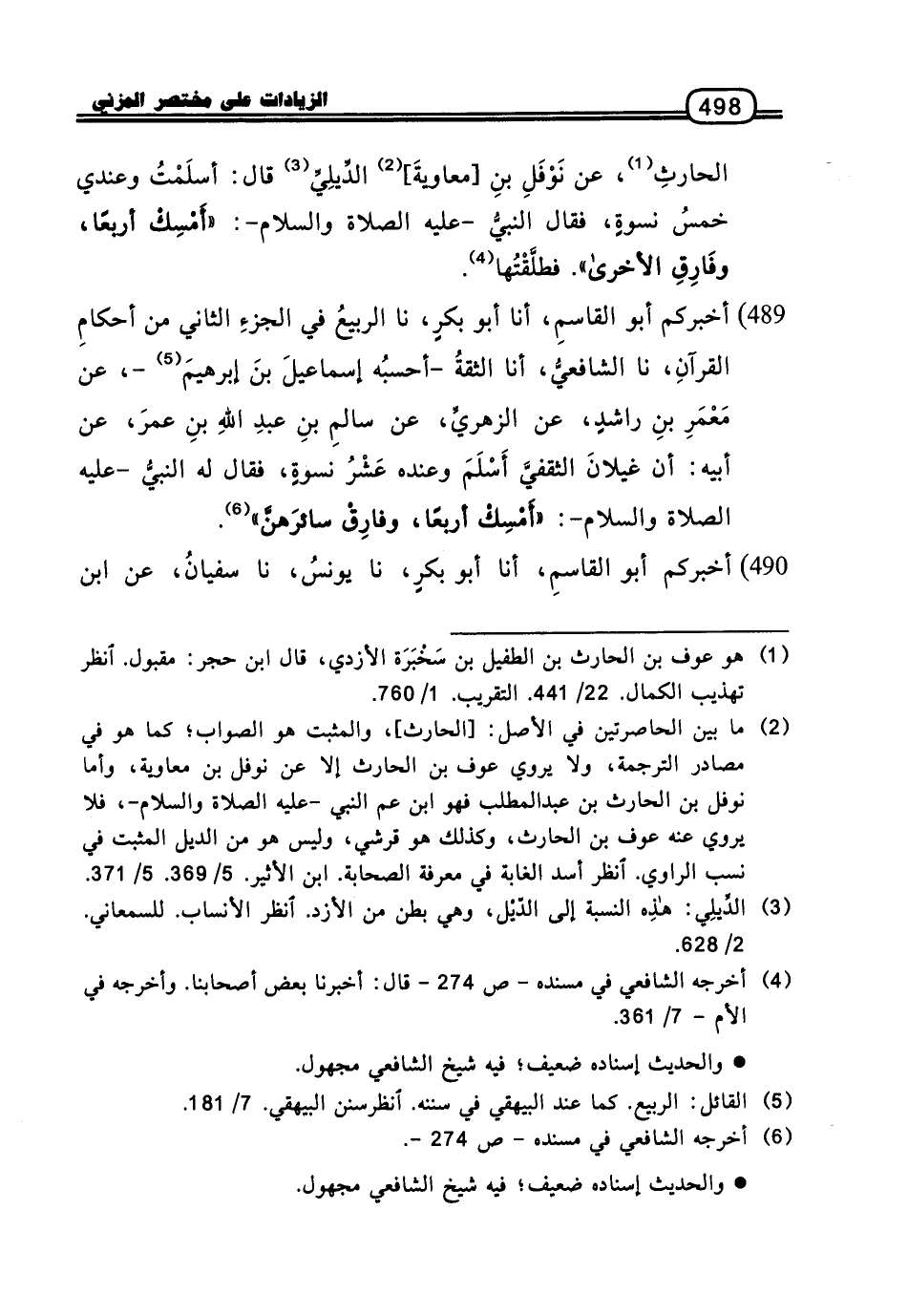 489 - أَخْبَرَكُمْ أَبُو الْقَاسِمِ، أنا أَبُو بَكْرٍ، نا الرَّبِيعُ فِي الْجُزْءِ الثَّانِي مِنْ أَحْكَامِ الْقُرْآنِ، نا الشَّافِعِيُّ، أنا الثِّقَةُ، أَحْسَبُهُ إِسْمَاعِيلَ بْنَ إِبْرَاهِيمَ، عَنْ مَعْمَرِ بْنِ رَاشِدٍ، عَنِ الزُّهْرِيِّ، عَنْ سَالِمِ بْنِ عَبْدِ اللَّهِ بْنِ عُمَرَ، عَنْ أَبِيهِ: أَنَّ غَيْلانَ الثَّقَفِيَّ أَسْلَمَ وَعِنْدَهُ عَشْرُ نِسْوَةٍ، فَقَالَ لَهُ النَّبِيُّ، عَلَيْهِ الصَّلاةُ وَالسَّلامُ، «أَمْسِكْ أَرْبَعًا، وَفَارِقْ سَائِرَهُنَّ»