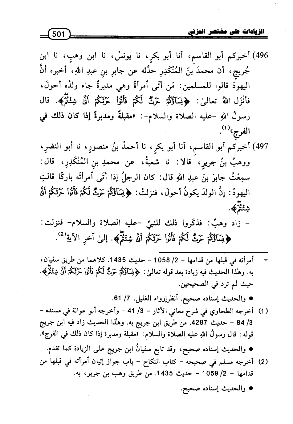 496 - أَخْبَرَكُمْ أَبُو الْقَاسِمِ، أنا أَبُو بَكْرٍ، نا يُونُسُ، نا ابْنُ وَهْبٍ، نا ابْنُ جُرَيْجٍ، أَنَّ مُحَمَّدَ بْنَ الْمُنْكَدِرِ حَدَّثَهُ عَنْ جَابِرِ بْنِ عَبْدِ اللَّهِ، أَخْبَرَهُ أَنَّ الْيَهُودَ قَالُوا لِلْمُسْلِمِينَ: مَنْ أَتَى امْرَأَةً، وَهِيَ مُدْبِرَةٌ جَاءَ وَلَدُهُ أَحْوَلَ، فَأَنْزَلَ اللَّهُ تَعَالَى: {نِسَاؤُكُمْ حَرْثٌ لَكُمْ فَأْتُوا حَرْثَكُمْ أَنَّى شِئْتُمْ} [البقرة: 223] .