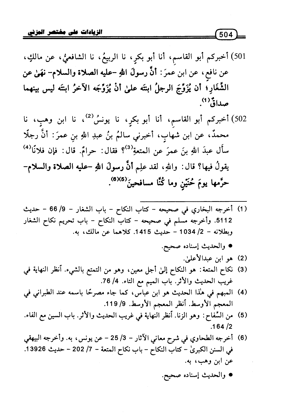 501 - أَخْبَرَكُمْ أَبُو الْقَاسِمِ، أنا أَبُو بَكْرٍ، نا الرَّبِيعُ، نا الشَّافِعِيُّ، عَنْ مَالِكٍ، عَنْ نَافِعٍ، عَنِ ابْنِ عُمَرَ: أَنَّ رَسُولَ اللَّهِ، عَلَيْهِ الصَّلاةُ وَالسَّلامُ، نَهَى عَنِ الشِّغَارِ؛ أَنْ يُزَوِّجَ الرَّجُلُ ابْنَتَهُ عَلَى أَنْ يُزَوِّجَهُ الآخَرُ ابْنَتَهُ لَيْسَ بَيْنَهُمَا صَدَاقٌ