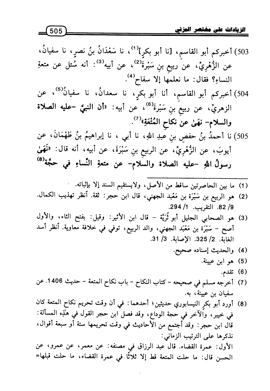 503 - أَخْبَرَكُمْ أَبُو الْقَاسِمِ، نا أَبُو بَكْرٍ، نا سَعْدَانُ بْنُ نَصْرٍ، نا سُفْيَانُ، عَنِ الزُّهْرِيِّ، عَنْ رَبِيعِ بْنِ سَبْرَةَ، عَنْ أَبِيهِ: أَنَّهُ سُئِلَ عَنْ مُتْعَةِ النِّسَاءِ؟ فَقَالَ: مَا نَعْلَمُهَا إِلا سِفَاحٌ