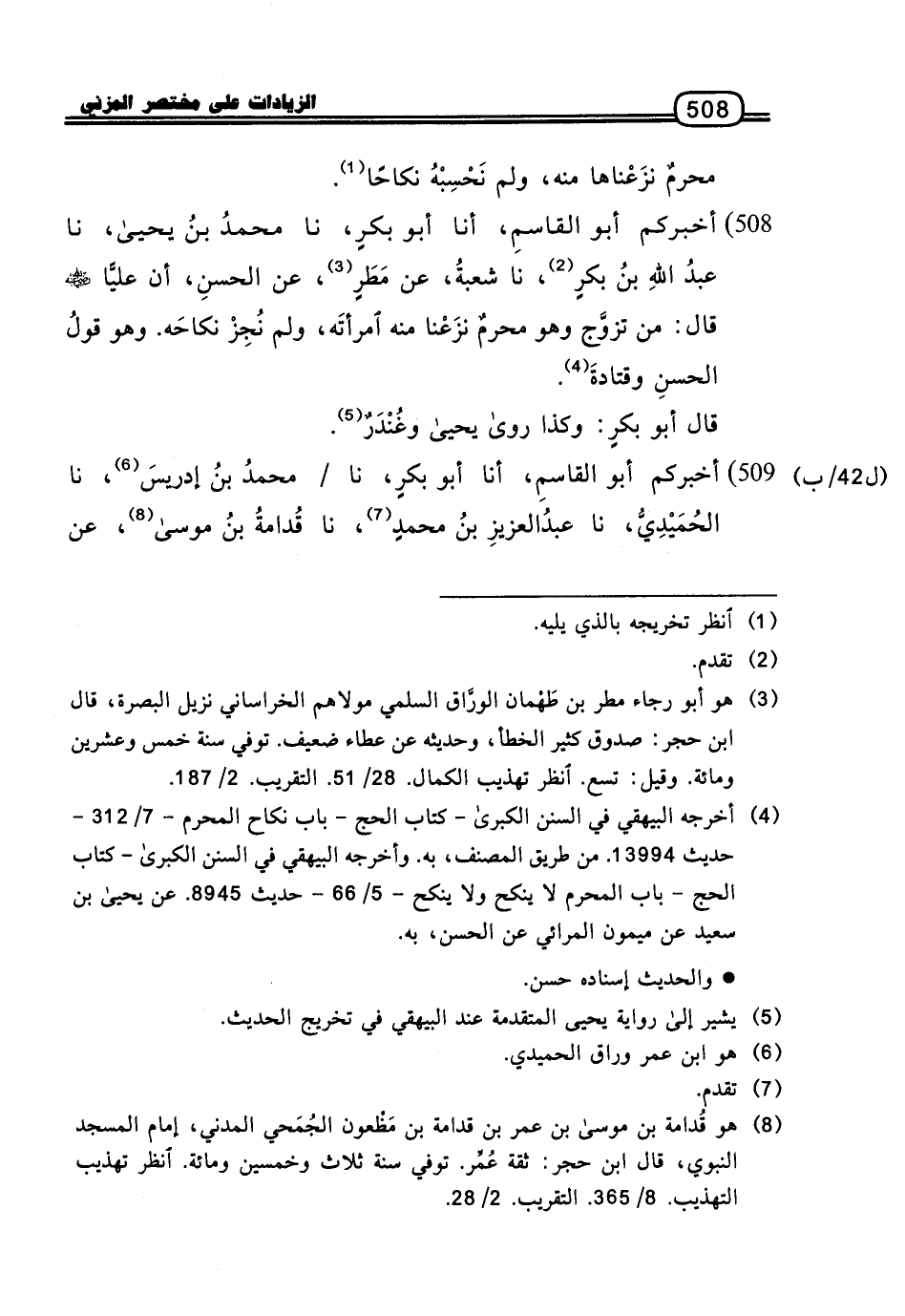 508 - أَخْبَرَكُمْ أَبُو الْقَاسِمِ، أنا أَبُو بَكْرٍ، نا مُحَمَّدُ بْنُ يَحْيَى، نا عَبْدُ اللَّهِ بْنُ بَكْرٍ، نا شُعْبَةُ، عَنْ مَطَرٍ، عَنِ الْحَسَنِ، أَنَّ عَلِيًّا رَضِيَ اللَّهُ عَنْهُ، قَالَ: مَنْ تَزَوَّجَ، وَهُوَ مُحْرِمٌ نَزَعْنَا مِنْهُ امْرَأَتَهُ، وَلَمْ نُجِزْ نِكَاحَهُ.