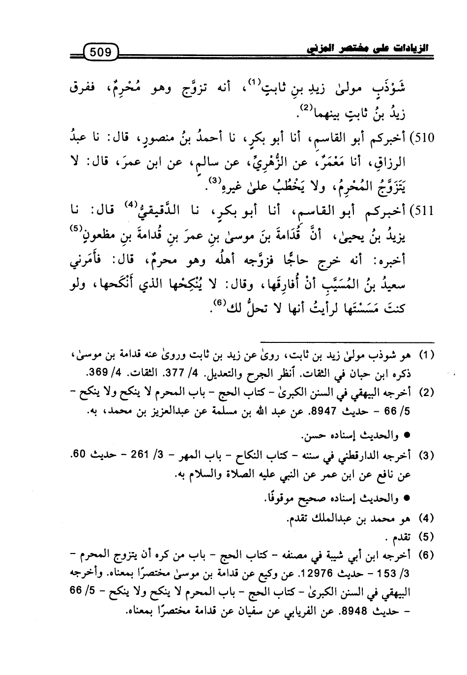 510 - أَخْبَرَكُمْ أَبُو الْقَاسِمِ، أنا أَبُو بَكْرٍ، نا أَحْمَدُ بْنُ مَنْصُورٍ، قَالَ: نا عَبْدُ الرَّزَّاقِ، أنا مَعْمَرٌ، عَنِ الزُّهْرِيِّ، عَنْ سَالِمٍ، عَنِ ابْنِ عُمَرَ، قَالَ: لا يَتَزَوَّجُ الْمُحْرِمُ، وَلا يَخْطُبُ عَلَى غَيْرِهِ