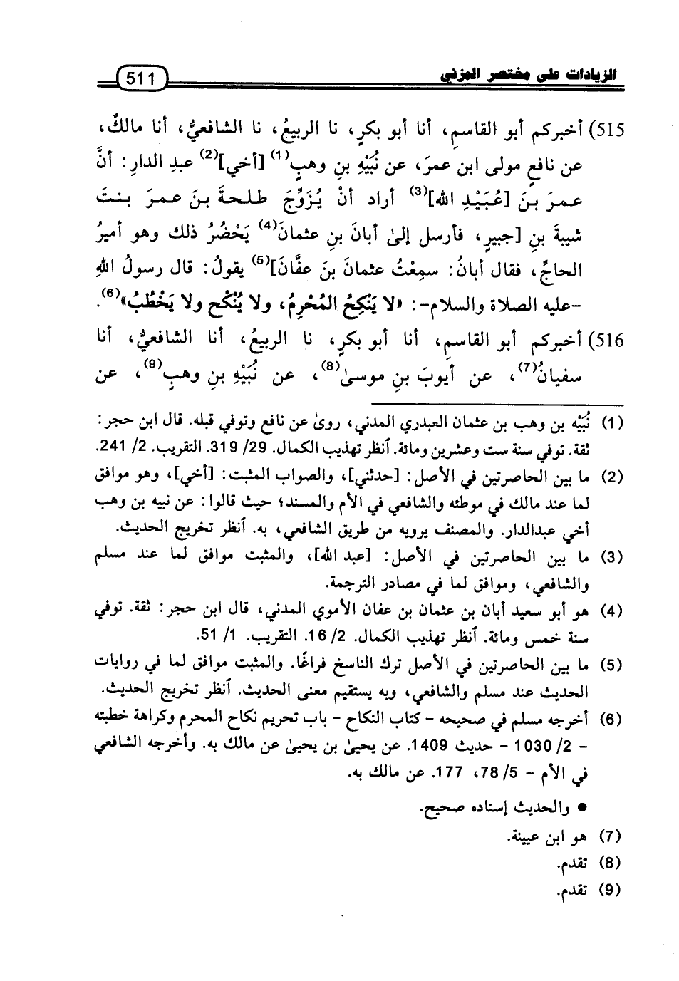 515 - أَخْبَرَكُمْ أَبُو الْقَاسِمِ، أنا أَبُو بَكْرٍ، نا الرَّبِيعُ، نا الشَّافِعِيُّ، أنا مَالِكٌ، عَنْ نَافِعٍ مَوْلَى ابْنِ عُمَرَ، عَنْ نُبَيْهِ بْنِ وَهْبٍ أَخِي عَبْدِ الدَّارِ: أَنَّ عُمَرَ بْنَ عُبَيْدِ اللَّهِ أَرَادَ أَنْ يُزَوِّجَ طَلْحَةَ بْنَ عُمَرَ بِنْتَ شَيْبَةَ بْنِ جُبَيْرٍ، فَأَرْسَلَ إِلَى أَبَانِ بْنِ عُثْمَانَ يَحْضُرُ ذَلِكَ وَهُوَ أَمِيرُ الْحَاجِّ، فَقَالَ أَبَانٌ: سَمِعْتُ عُثْمَانَ بْنَ عَفَّانَ يَقُولُ: قَالَ رَسُولُ اللَّهِ، عَلَيْهِ الصَّلاةُ وَالسَّلامُ: «لا يَنْكِحُ الْمُحْرِمُ، وَلا يُنْكَحُ وَلا يَخْطُبُ» .