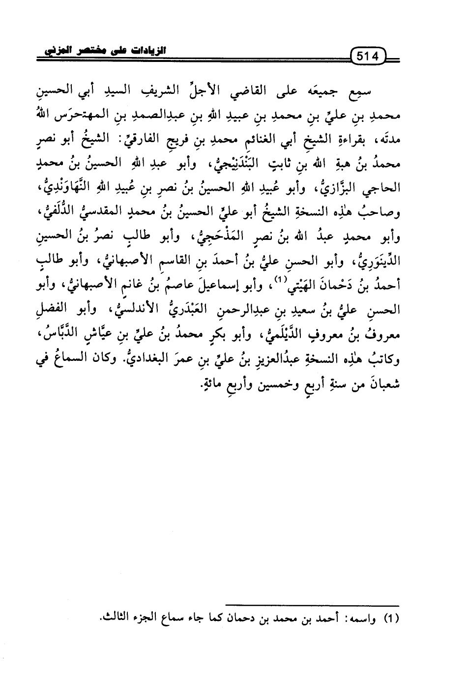 سَمِعَ جَمِيعَهُ عَلَى الْقَاضِي الأَجَلِّ الشَّرِيفِ السَّيِّدِ أَبِي الْحُسَيْنِ مُحَمَّدِ بْنِ عَلِيِّ بْنِ مُحَمَّدِ بْنِ عُبَيْدِ اللَّهِ بْنِ عَبْدِ الصَّمَدِ بْنِ الْمُهْتَدِي، حَرَسَ اللَّهُ مُدَّتَهُ، بِقِرَاءَةِ الشَّيْخِ أَبِي الْغَنَائِمِ مُحَمَّدِ بْنِ فُرَيْجٍ الْفَارِقِيِّ: الشَّيْخُ أَبُو نَصْرٍ مُحَمَّدُ بْنُ هِبَةِ اللَّهِ بْنِ ثَابِتٍ الْبَنْدَنِيجِيُّ، وَأَبُو عَبْدِ اللَّهِ الْحُسَيْنُ بْنُ مُحَمَّدٍ الْحَاجِيُّ الْبَزَّازِيُّ، وَأَبُو عُبَيْدِ اللَّهِ الْحُسَيْنُ بْنُ نَصْرِ بْنِ عُبَيْدِ اللَّهِ النُّهَاوَنْدِيُّ، وَصَاحِبُ هَذِهِ النُّسْخَةِ الشَّيْخُ أَبُو عَلِيٍّ الْحُسَيْنُ بْنُ مُحَمَّدٍ الْمَقْدِسِيُّ الدُّلَفِيُّ، وَأَبُو مُحَمَّدٍ عَبْدُ اللَّهِ بْنُ نَصْرٍ الْمَذْحِجِيُّ، وَأَبُو طَالِبٍ نَصْرُ بْنُ الْحُسَيْنِ الدِّينَوَرِيُّ، وَأَبُو الْحَسَنِ عَلِيُّ بْنُ أَحْمَدَ بْنِ الْقَاسِمِ الأَصْبَهَانِيُّ، وَأَبُو طَالِبٍ أَحْمَدُ بْنُ دَحْمَانَ الْهِيتِيُّ، وَأَبُو إِسْمَاعِيلَ عَاصِمُ بْنُ غَانِمٍ الأَصْبَهَانِيُّ، وَأَبُو الْحَسَنِ عَلِيُّ بْنُ سَعِيدِ بْنِ عَبْدِ الرَّحْمَنِ الْعَبْدَرِيُّ الأَنْدَلُسِيُّ، وَأَبُو الْفَضْلِ مَعْرُوفُ بْنُ مَعْرُوفٍ الدَّيْلَمِيُّ، وَأَبُو بَكْرٍ مُحَمَّدُ بْنُ عَلِيِّ بْنِ عَيَّاشٍ الدَّبَّاسُ، وَكَاتِبُ هَذِهِ النُّسْخَةِ عَبْدُ الْعَزِيزِ بْنُ عَلِيِّ بْنِ عُمَرَ الْبَغْدَادِيُّ.