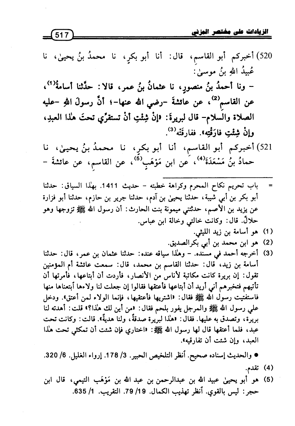 520 - أَخْبَرَكُمْ أَبُو الْقَاسِمِ، قَالَ: أنا أَبُو بَكْرٍ، نا مُحَمَّدُ بْنُ يَحْيَى، نا عُبَيْدُ اللَّهِ بْنُ مُوسَى:، وَنا أَحْمَدُ بْنُ مَنْصُورٍ، نا عُثْمَانُ بْنُ عُمَرَ، قَالا: حَدَّثَنَا أُسَامَةُ، عَنِ الْقَاسِمِ، عَنْ عَائِشَةَ، رَضِيَ اللَّهُ عَنْهَا،؛ أَنَّ رَسُولَ اللَّهِ، عَلَيْهِ الصَّلاةُ وَالسَّلامُ، قَالَ لِبَرِيرَةَ: «إِنْ شِئْتِ أَنْ تَسْتَقِرِّي تَحْتَ هَذَا الْعَبْدِ، وَإِنْ شِئْتِ فَارَقْتِهِ» .