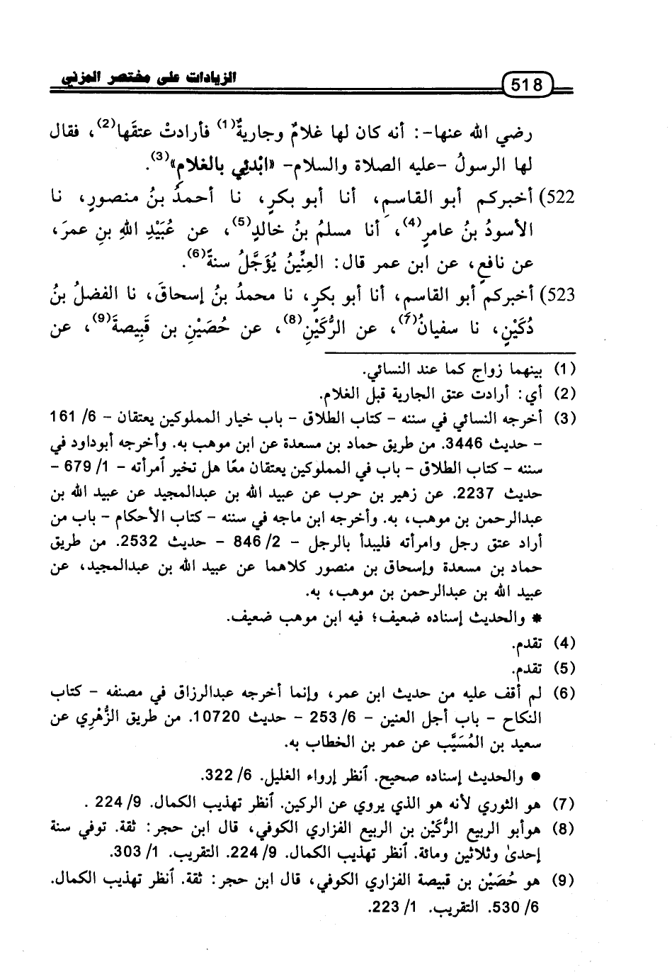 522 - أَخْبَرَكُمْ أَبُو الْقَاسِمِ، أنا أَبُو بَكْرٍ، نا أَحْمَدُ بْنُ مَنْصُورٍ، نا الأَسْوَدُ بْنُ عَامِرٍ، أنا مُسْلِمُ بْنُ خَالِدٍ، عَنْ عُبَيْدِ اللَّهِ بْنِ عُمَرَ، عَنْ نَافِعٍ، عَنِ ابْنِ عُمَرَ، قَالَ: الْعِنِّينُ يُؤَجَّلُ سَنَةً