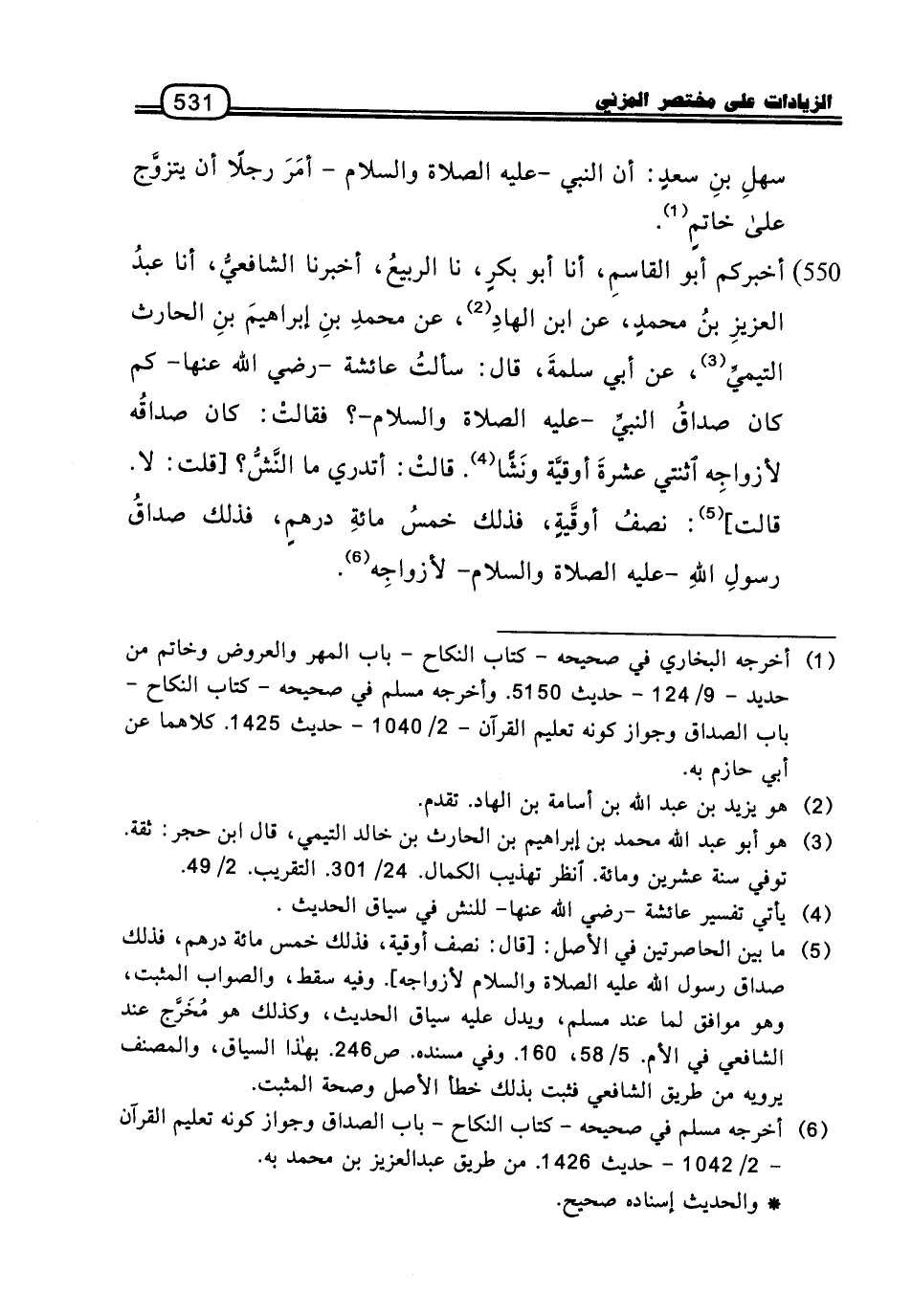 550 - أَخْبَرَكُمْ أَبُو الْقَاسِمِ، أنا أَبُو بَكْرٍ، نا الرَّبِيعُ، أَخْبَرَنَا الشَّافِعِيُّ، أنا عَبْدُ الْعَزِيزِ بْنُ مُحَمَّدٍ، عَنِ ابْنِ الْهَادِ، عَنْ مُحَمَّدِ بْنِ إِبْرَاهِيمَ بْنِ الْحَارِثِ التَّيْمِيِّ، عَنْ أَبِي سَلَمَةَ، قَالَ: سَأَلْتُ عَائِشَةَ، رَضِيَ اللَّهُ عَنْهَا، كَمْ كَانَ صَدَاقُ النَّبِيِّ، عَلَيْهِ الصَّلاةُ وَالسَّلامُ،؟ فَقَالَتْ: كَانَ صَدَاقُهُ لأَزْوَاجِهِ اثْنَتَيْ عَشْرَةَ أُوقِيَّةً وَنَشًّا.