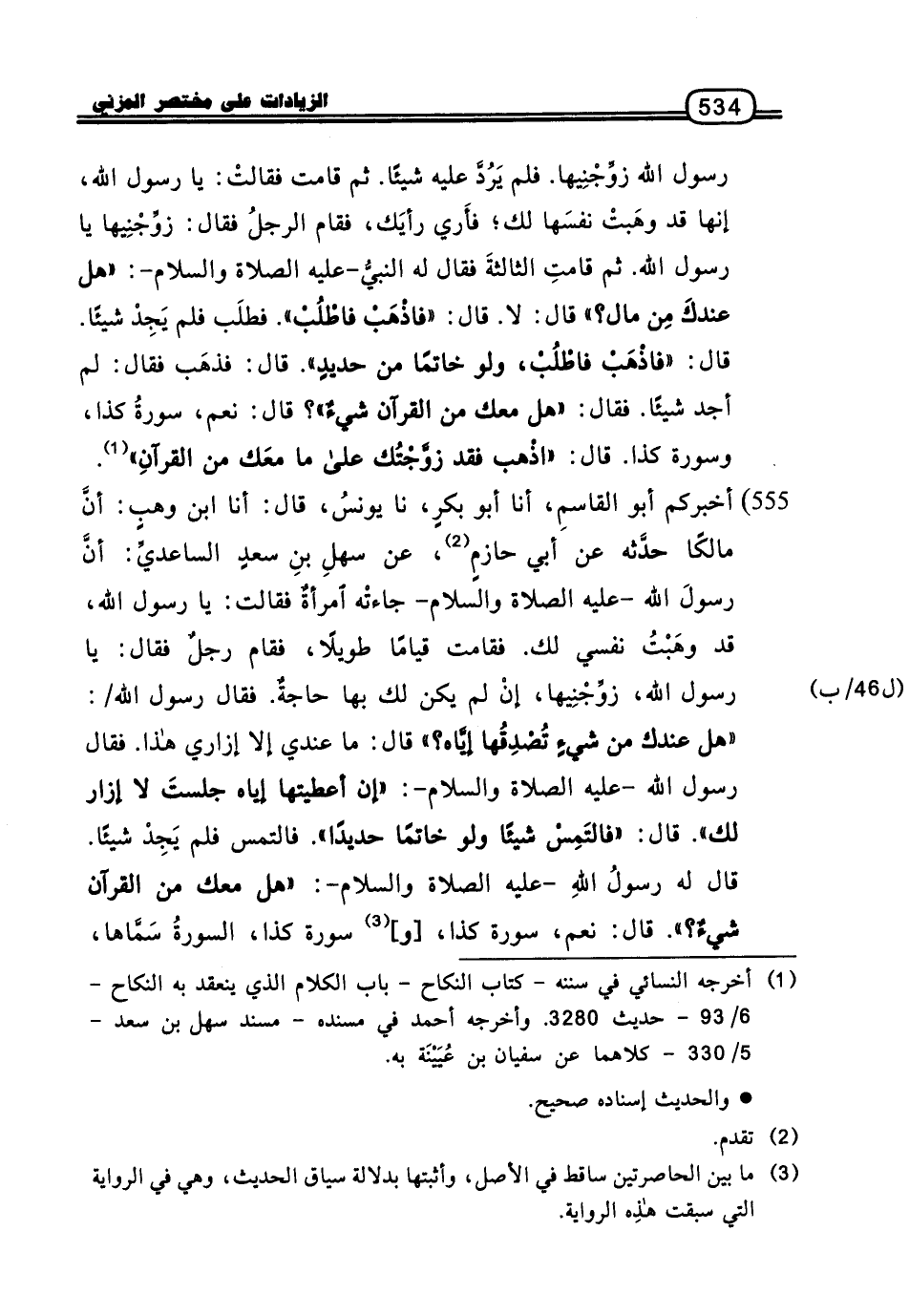 555 - أَخْبَرَكُمْ أَبُو الْقَاسِمِ، أنا أَبُو بَكْرٍ، نا يُونُسُ، قَالَ: أنا ابْنُ وَهْبٍ: أَنَّ مَالِكًا حَدَّثُه عَنْ أَبِي حَازِمٍ، عَنْ سَهْلِ بْنِ سَعْدٍ السَّاعِدِيِّ: أَنَّ رَسُولَ اللَّهِ، عَلَيْهِ الصَّلاةُ وَالسَّلامُ، جَاءَتْهُ امْرَأَةٌ، فَقَالَتْ: يَا رَسُولَ اللَّهِ، قَدْ وَهَبْتُ نَفْسِي لَكَ.