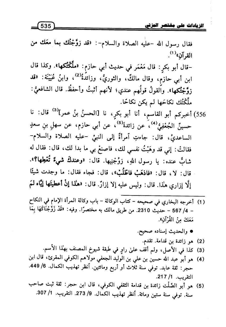 وَكَذَا قَالَ ابْنُ أَبِي حَازِمٍ، وَقَالَ مَالِكٌ، وَالثَّوْرِيُّ، وَزَائِدَةُ، وَابْنُ عُيَيْنَةَ: «قَدْ زَوَّجْتُكَهَا» .