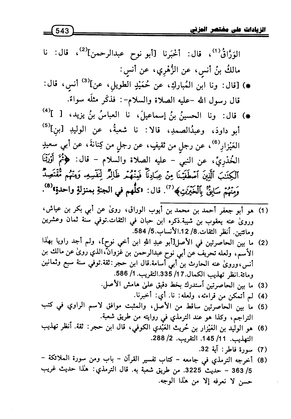 الْوَرَّاقُ، قَالَ: أَخْبَرَنَا أَبُو نُوحٍ عَبْدُ الرَّحْمَنِ، قَالَ: نا مَالِكُ بْنُ أَنَسٍ، عَنِ الزُّهْرِيِّ، عَنْ أَنَسٍ: قَالَ: وَنا ابْنُ الْمُبَارَكِ، عَنْ حُمَيْدٍ الطَّوِيلِ، عَنْ أَنَسٍ، قَالَ: قَالَ رَسُولُ اللَّهِ، عَلَيْهِ الصَّلاةُ وَالسَّلامُ: فَذَكَرَ مِثْلَهُ سَوَاءً