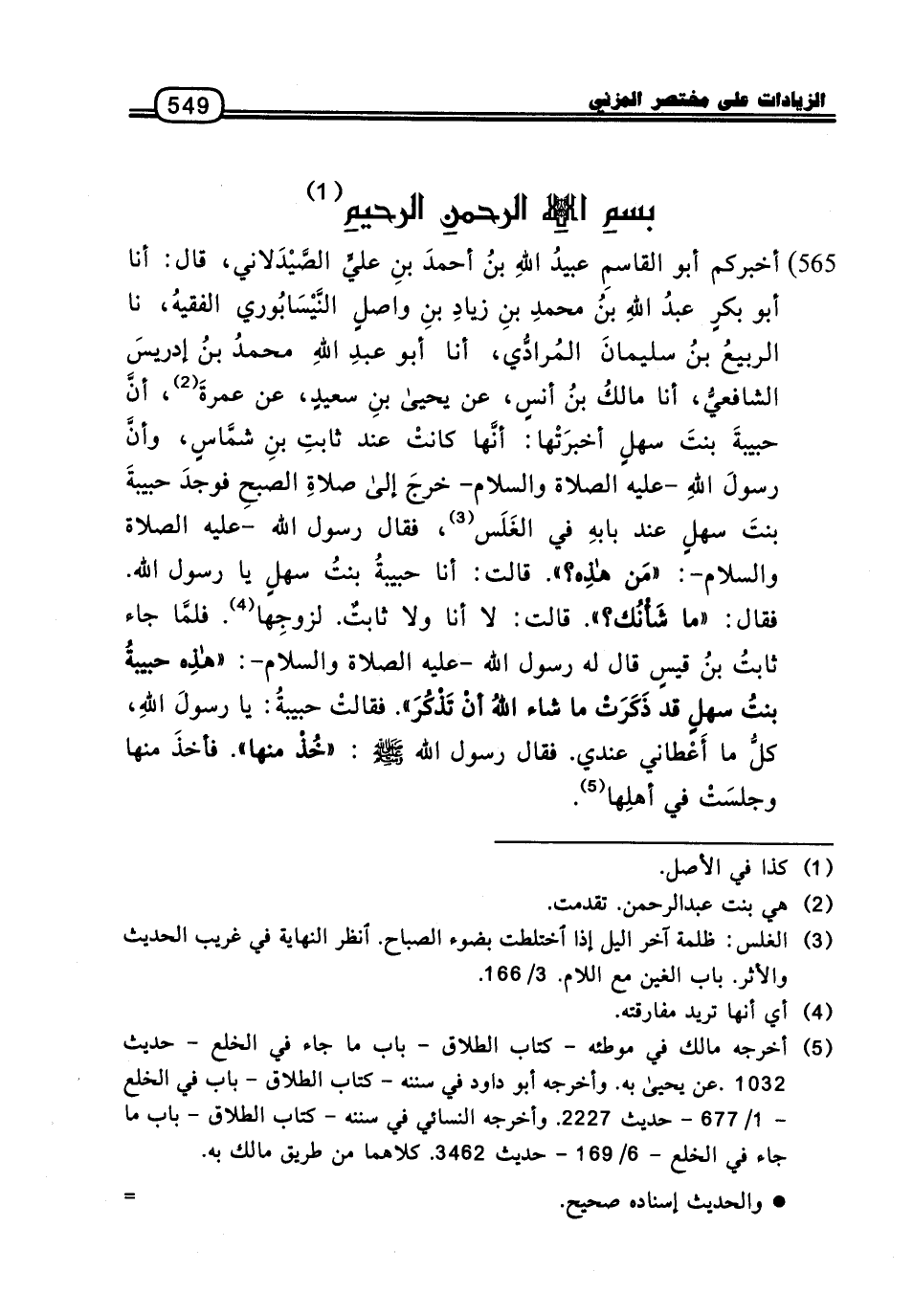 565 - أَخْبَرَكُمْ أَبُو الْقَاسِمِ عُبَيْدُ اللَّهِ بْنُ أَحْمَدَ بْنِ عَلِيٍّ الصَّيْدَلانِيُّ، قَالَ: أنا أَبُو بَكْرٍ عَبْدُ اللَّهِ بْنُ مُحَمَّدِ بْنِ زِيَادِ بْنِ وَاصِلٍ النَّيْسَابُورِيُّ الْفَقِيهُ، نا الرَّبِيعُ بْنُ سُلَيْمَانَ الْمُرَادِيُّ، أنا أَبُو عَبْدِ اللَّهِ مُحَمَّدُ بْنُ إِدْرِيسَ الشَّافِعِيُّ، أنا مَالِكُ بْنُ أَنَسٍ، عَنْ يَحْيَى بْنِ سَعِيدٍ، عَنْ عَمْرَةَ، أَنَّ حَبِيبَةَ بِنْتَ سَهْلٍ أَخْبَرَتْهَا: أَنَّهَا كَانَتْ عِنْدَ ثَابِتِ بْنِ شَمَّاسٍ، وَأَنَّ رَسُولَ اللَّهِ، عَلَيْهِ الصَّلاةُ وَالسَّلامُ، خَرَجَ إِلَى صَلاةِ الصُّبْحِ فَوَجَدَ حَبِيبَةَ بِنْتَ سَهْلٍ عِنْدَ بَابِهِ فِي الْغَلَسِ، فَقَالَ رَسُولُ اللَّهِ، عَلَيْهِ الصَّلاةُ وَالسَّلامُ: «مَنْ هَذِهِ؟» .