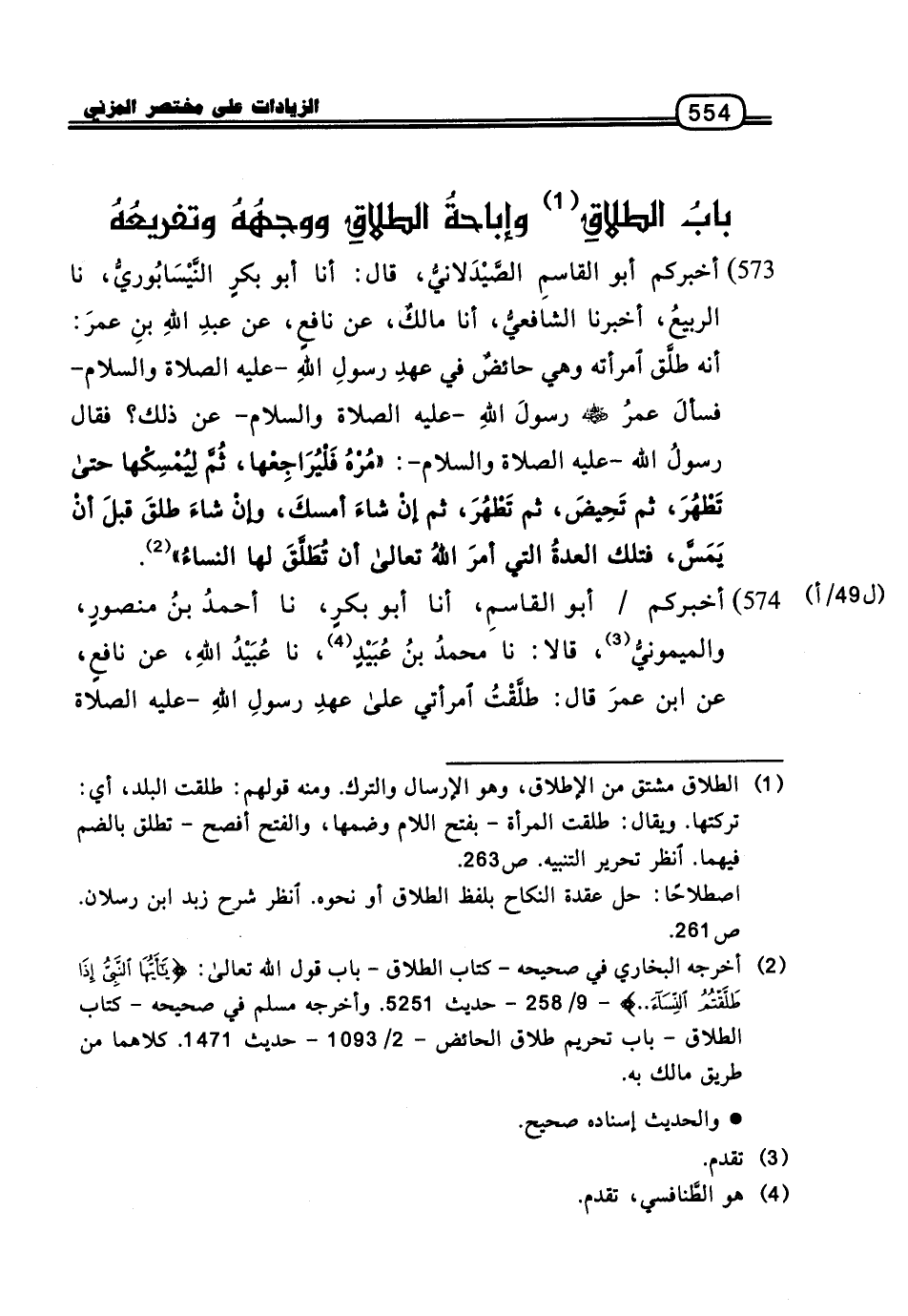 573 - أَخْبَرَكُمْ أَبُو الْقَاسِمِ الصَّيْدَلانِيُّ، قَالَ: أنا أَبُو بَكْرٍ النَّيْسَابُورِيُّ، نا الرَّبِيعُ، أَخْبَرَنَا الشَّافِعِيُّ، أنا مَالِكٌ، عَنْ نَافِعٍ، عَنْ عَبْدِ اللَّهِ بْنِ عُمَرَ: أَنَّهُ طَلَّقَ امْرَأَتَهُ وَهِيَ حَائِضٌ فِي عَهْدِ رَسُولِ اللَّهِ، عَلَيْهِ الصَّلاةُ وَالسَّلامُ، فَسَأَلَ عُمَرُ رَضِيَ اللَّهُ عَنْهُ رَسُولَ اللَّهِ، عَلَيْهِ الصَّلاةُ وَالسَّلامُ، عَنْ ذَلِكَ؟ فَقَالَ رَسُولُ اللَّهِ، عَلَيْهِ الصَّلاةُ وَالسَّلامُ: «مُرْهُ فَلْيُرَاجِعْهَا، ثُمَّ لِيُمْسِكْهَا حَتَّى تَطْهُرَ، ثُمَّ تَحِيضَ، ثُمَّ تَطْهُرَ، ثُمَّ إِنْ شَاءَ أَمْسَكَ، وَإِنْ شَاءَ طَلَّقَ قَبْلَ أَنْ يَمَسَّ، فَتِلْكَ الْعِدَّةُ الَّتِي أَمَرَ اللَّهُ تَعَالَى أَنْ تُطَلَّقَ لَهَا النِّسَاءُ»