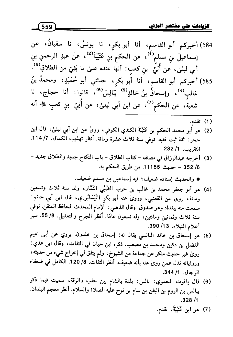 584 - أَخْبَرَكُمْ أَبُو الْقَاسِمِ، أنا أَبُو بَكْرٍ، نا يُونُسُ، نا سُفْيَانُ، عَنْ إِسْمَاعِيلَ بْنِ مُسْلِمٍ، عَنِ الْحَكَمِ بْنِ عُتَيْبَةَ، عَنْ عَبْدِ الرَّحْمَنِ بْنِ أَبِي لَيْلَى، عَنْ أُبَيِّ بْنِ كَعْبٍ: أَنَّهَا عِنْدَهُ مَا بَقِيَ مِنَ الطَّلاقِ.