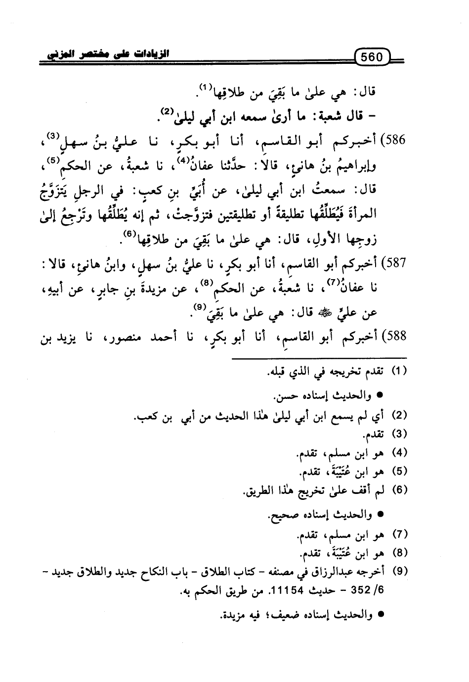 586 - أَخْبَرَكُمْ أَبُو الْقَاسِمِ، أنا أَبُو بَكْرٍ، نا عَلِيُّ بْنُ سَهْلٍ، وَإِبْرَاهِيمُ بْنُ هَانِئٍ، قَالا: حَدَّثَنَا عَفَّانُ، نا شُعْبَةُ، عَنِ الْحَكَمِ، قَالَ: سَمِعْتُ ابْنَ أَبِي لَيْلَى، عَنْ أُبَيِّ بْنِ كَعْبٍ: فِي الرَّجُلِ يَتَزَوَّجُ الْمَرْأَةَ فَيُطَلِّقُهَا تَطْلِيقَةً أَوْ تَطْلِيقَتَيْنِ فَتَزَوَّجَتْ، ثُمَّ إِنَّهُ يُطَلِّقُهَا وَتَرْجِعُ إِلَى زَوْجِهَا الأَوَّلِ، قَالَ: هِيَ عَلَى مَا بَقِيَ مِنْ طَلاقِهَا.